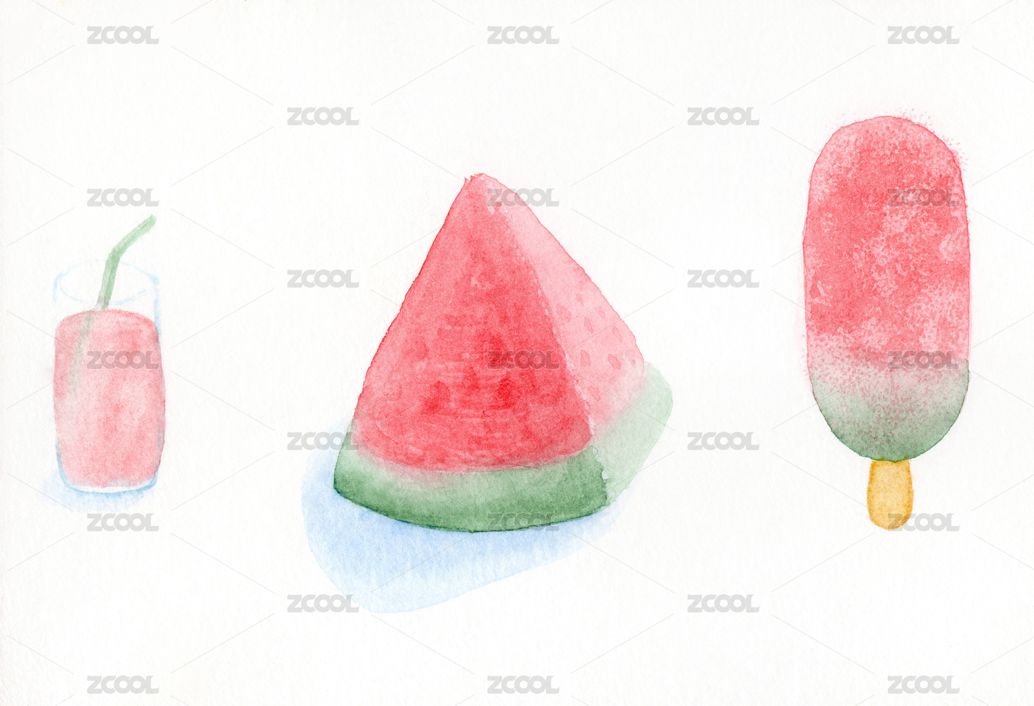 在夏天吃冷饮、西瓜和冰棒的清新插画