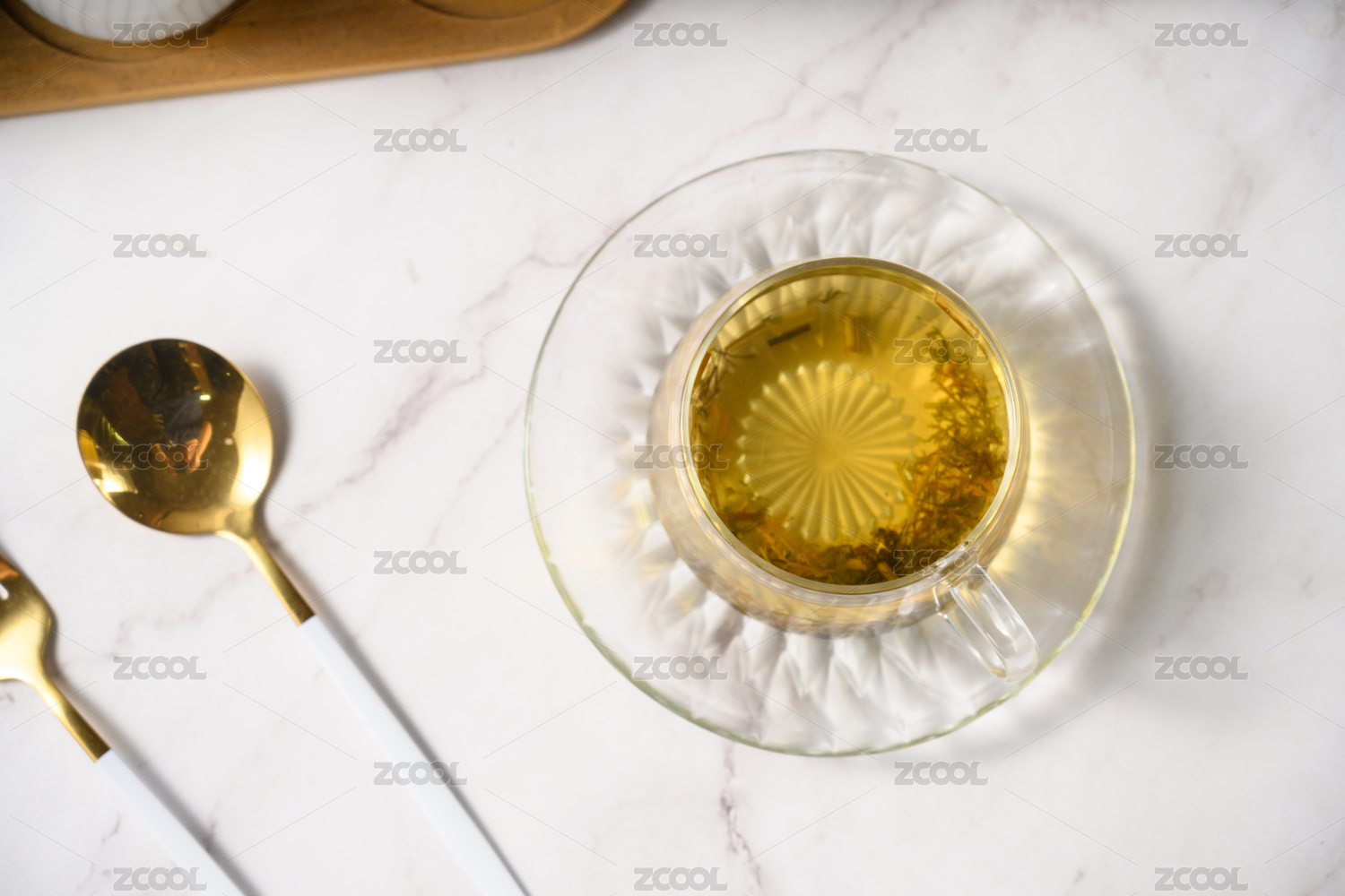 桌面上的杯子里的甘甜可口的茶花花茶