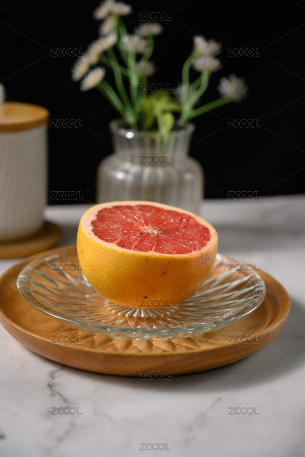 桌面上的盘子里的切开的西柚