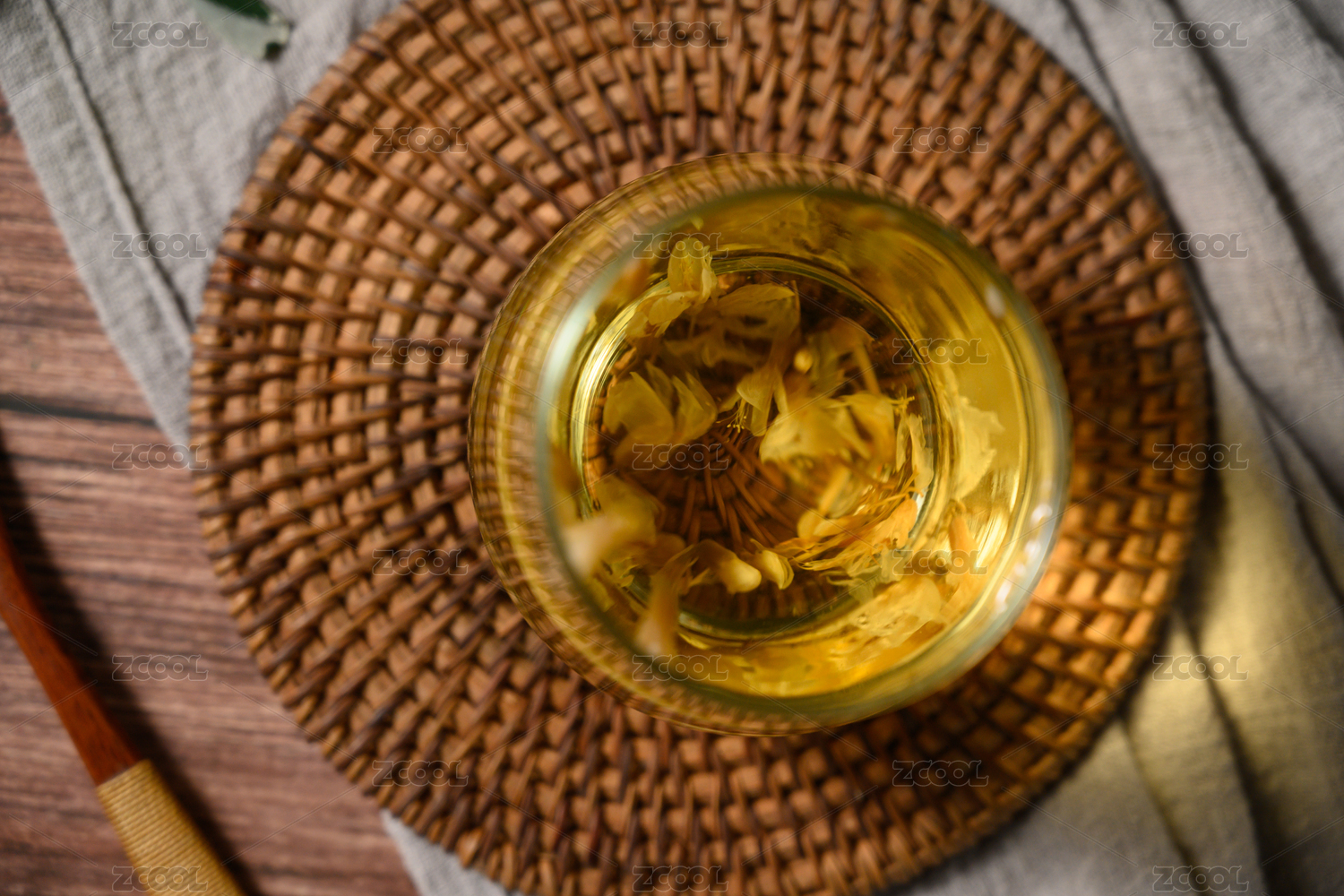 桌面上的杯子里的甘甜可口的金盏菊花茶