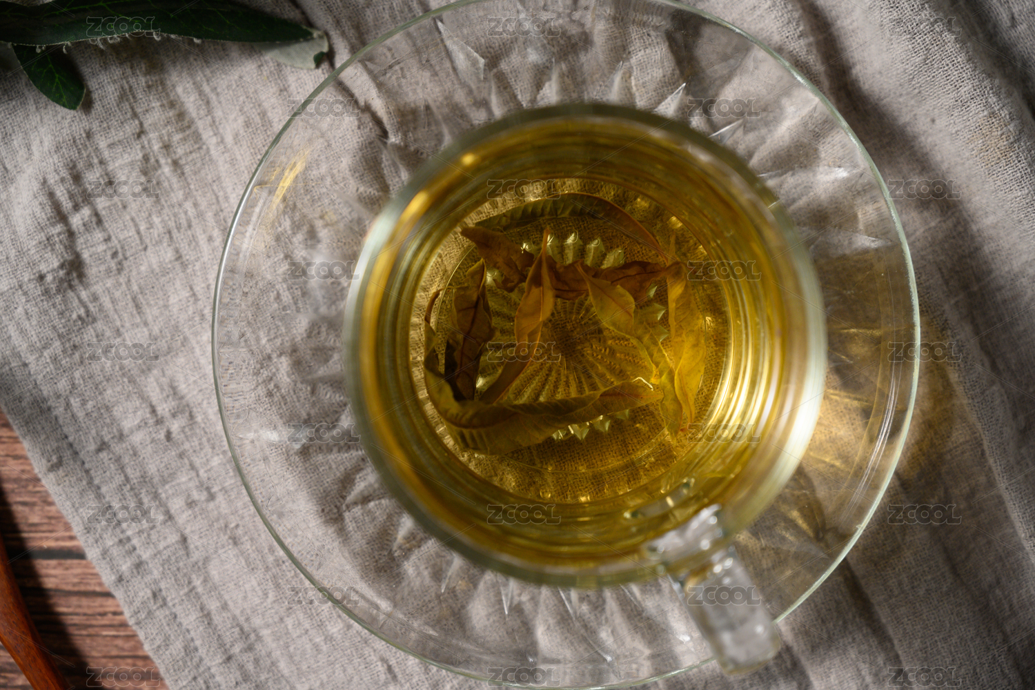 桌面上的杯子里的甘甜可口的马鞭草茶