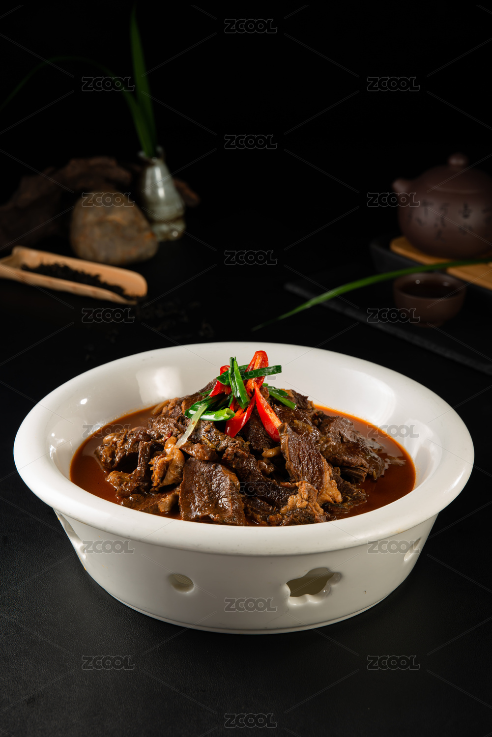 棕色木纹桌面上放着一盘膳房口蘑焖牛肉