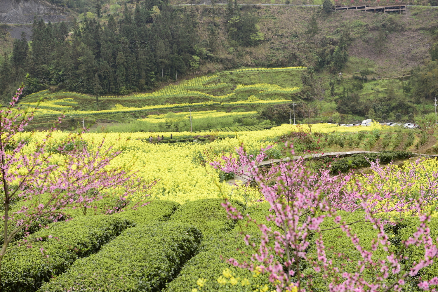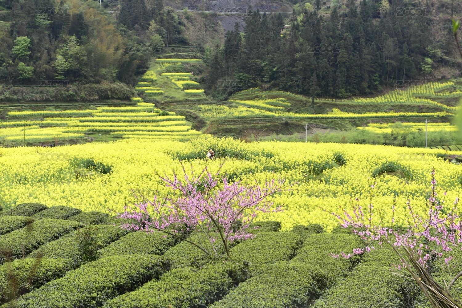 春天茶园里开放的桃花