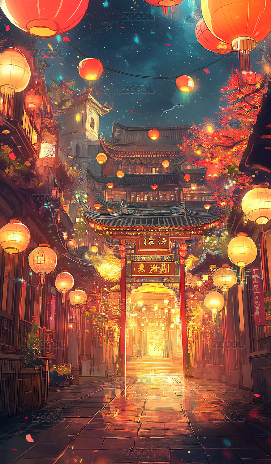 灯笼夜市星空璀璨梦幻街景