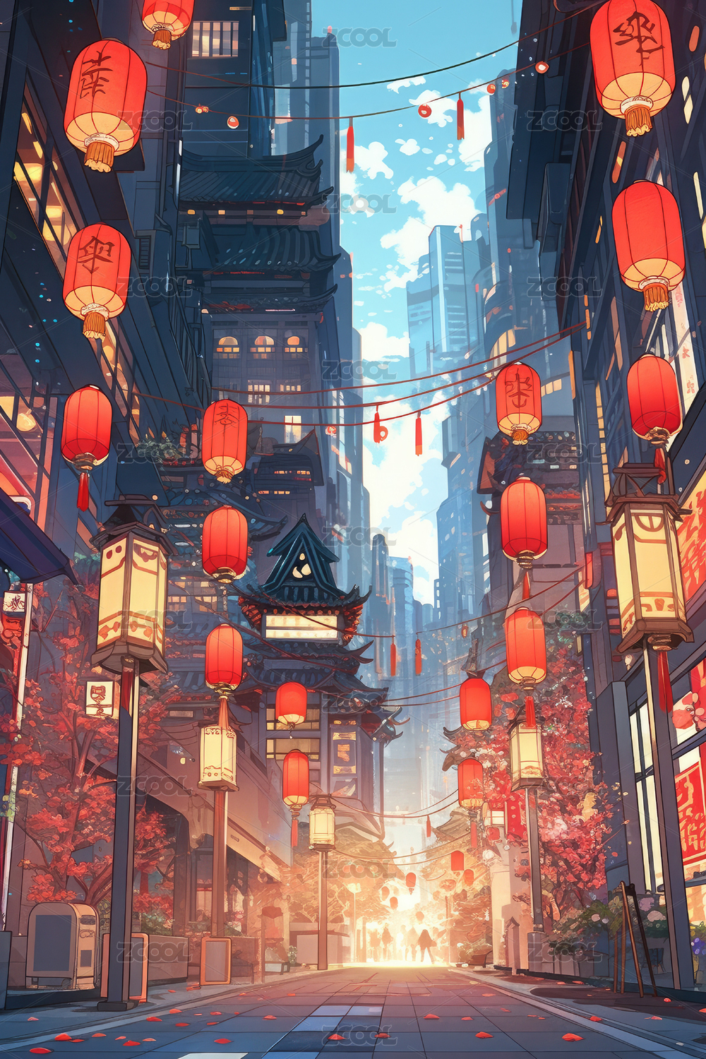 挂满红灯笼的现代城市街道