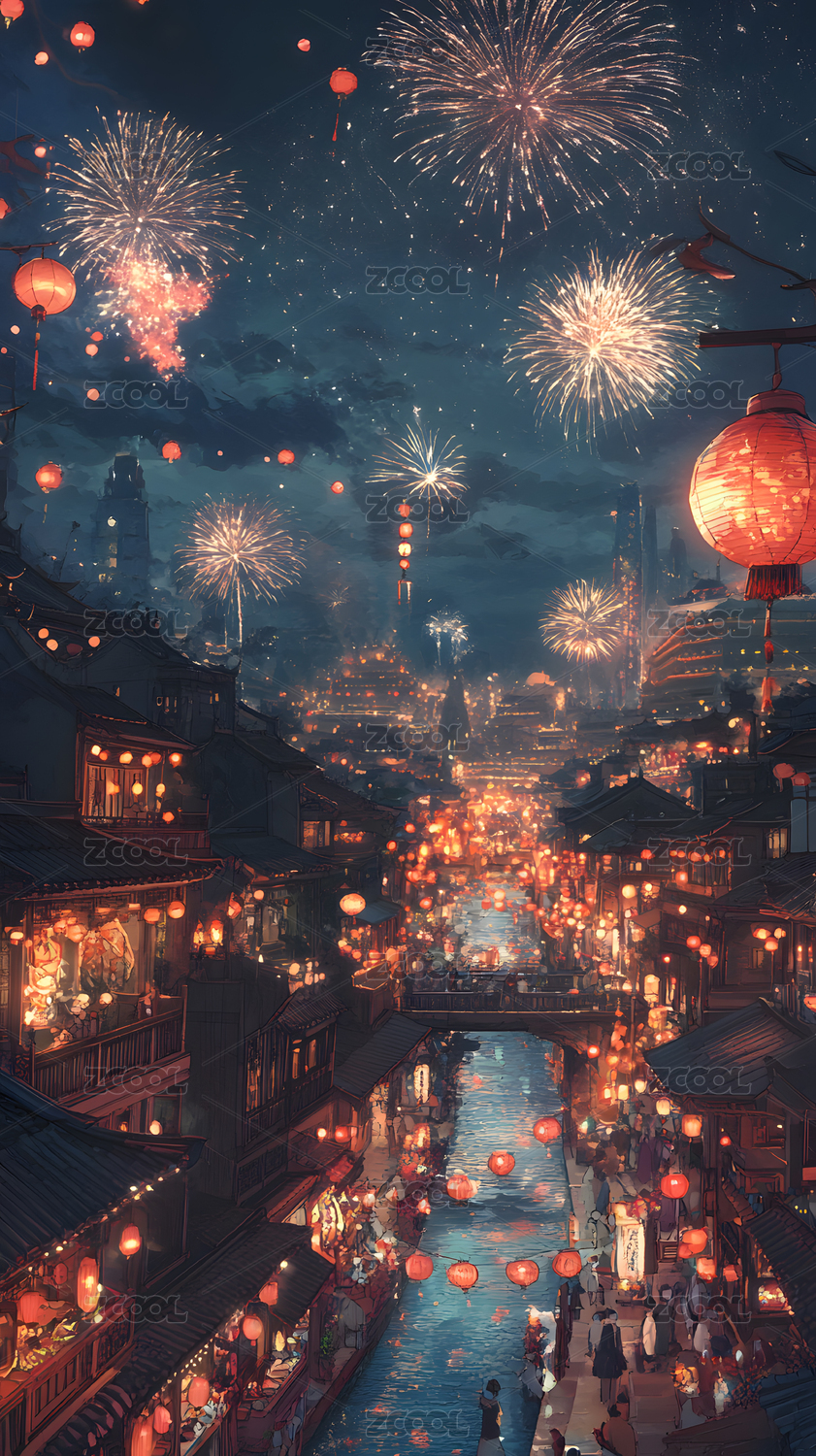 夜市灯笼高挂烟花绽放