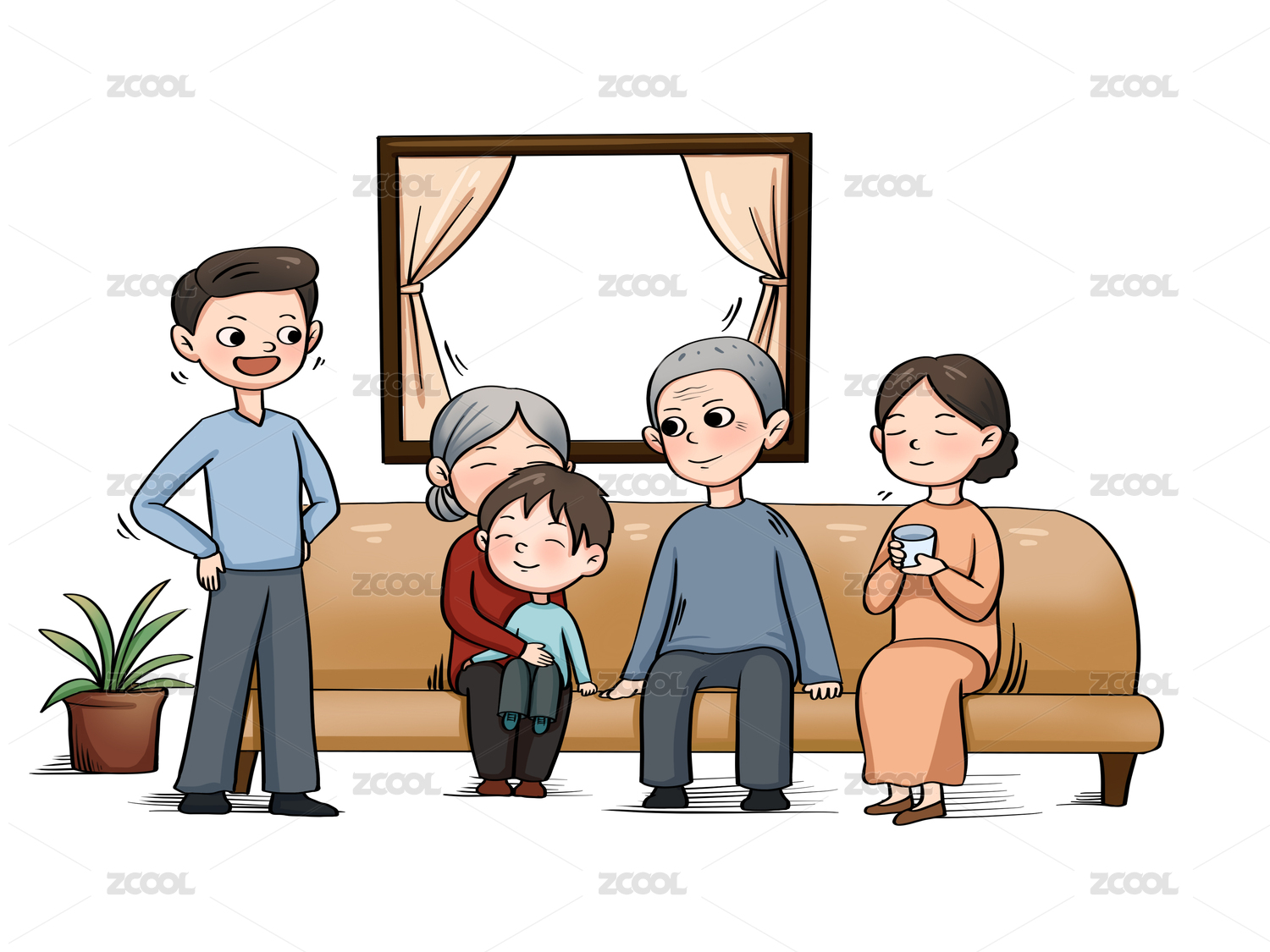 婚姻家庭关系一家五口人沙发花盆窗户漫