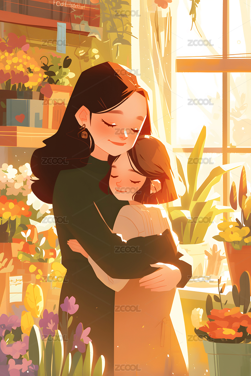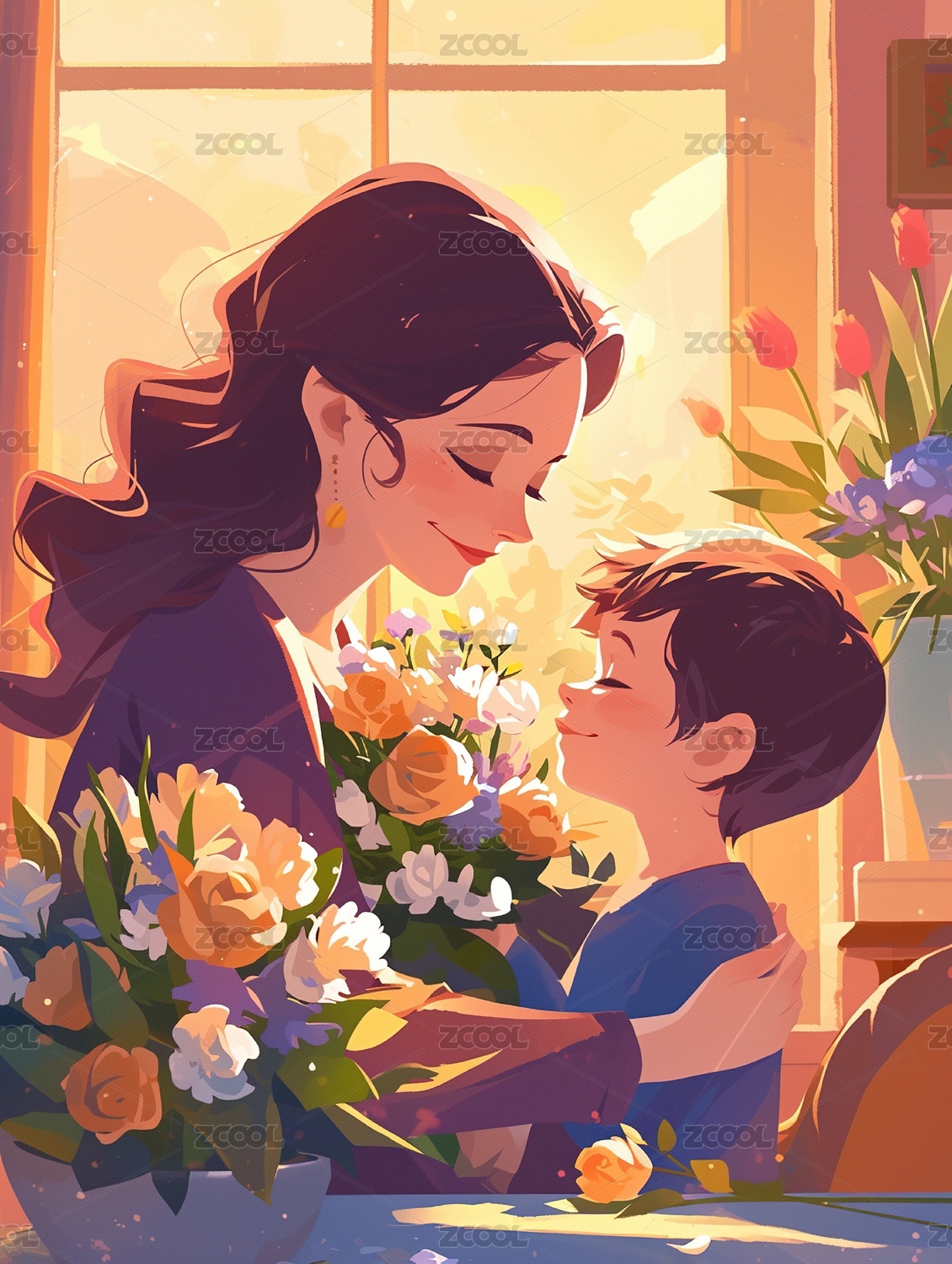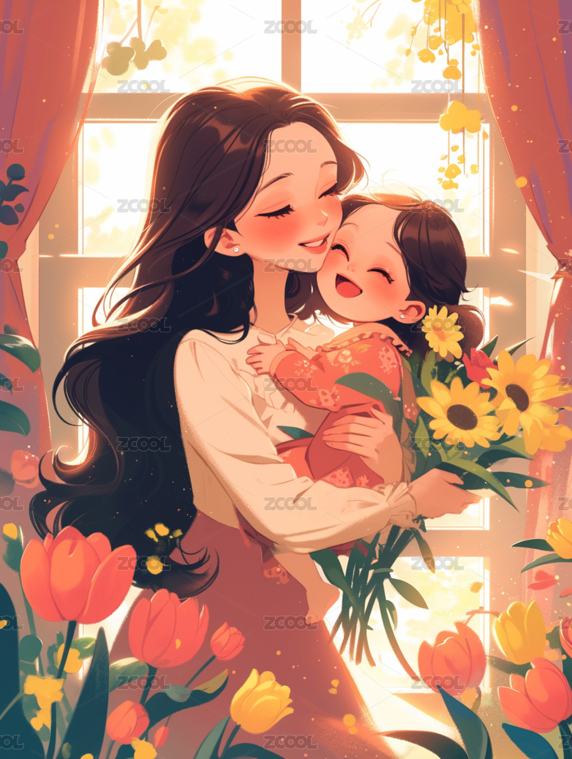 母亲和女儿手捧鲜花的场景,母亲节感恩节