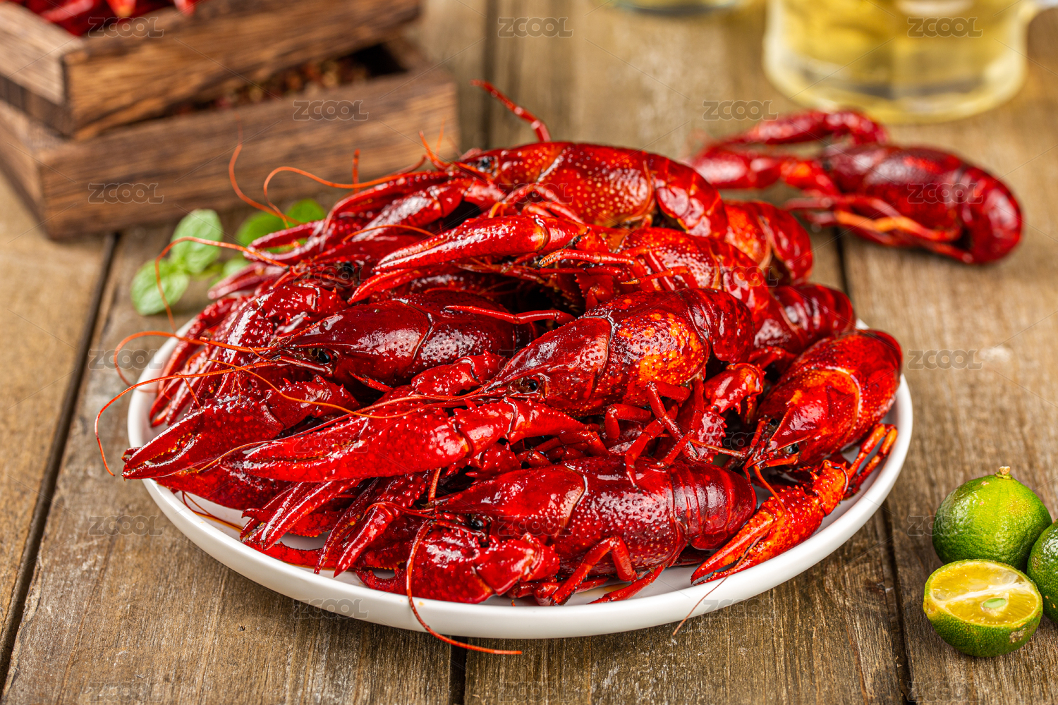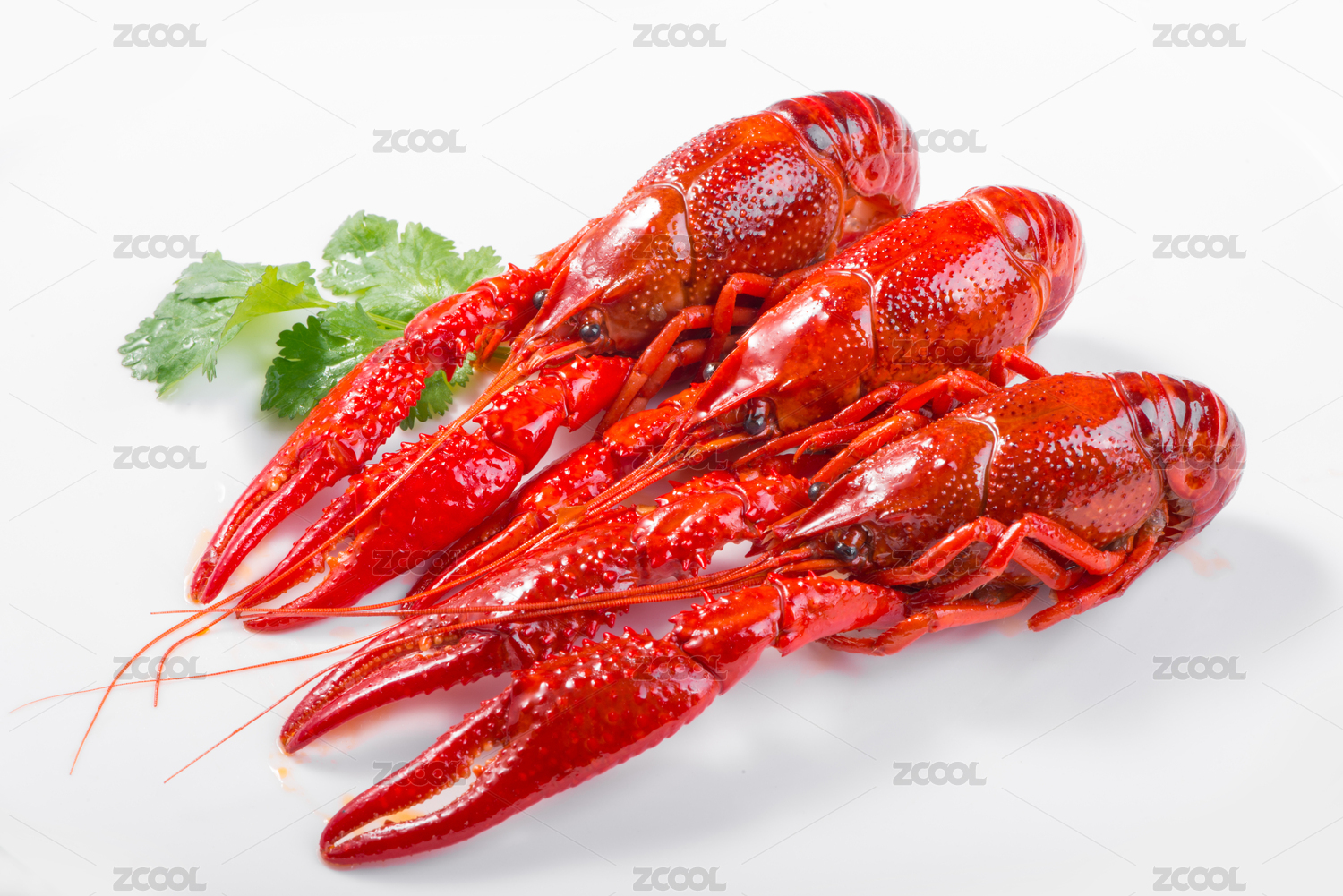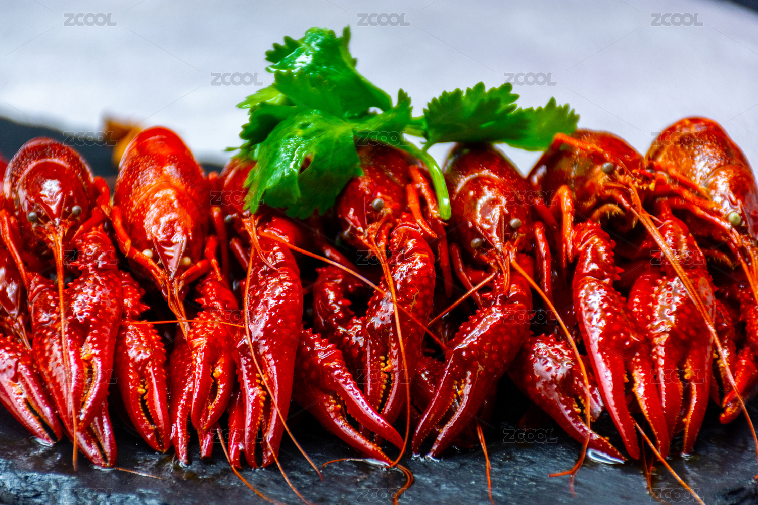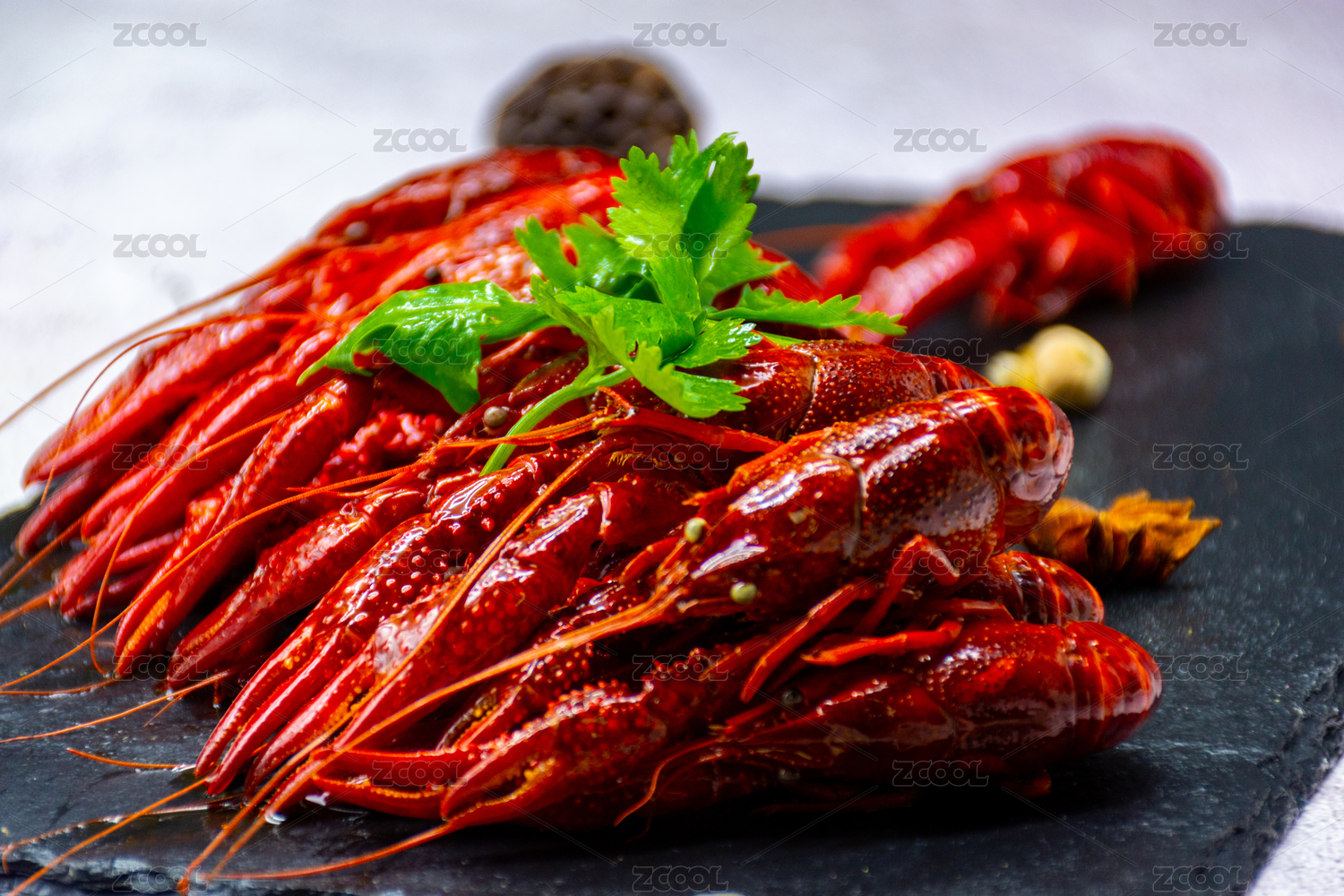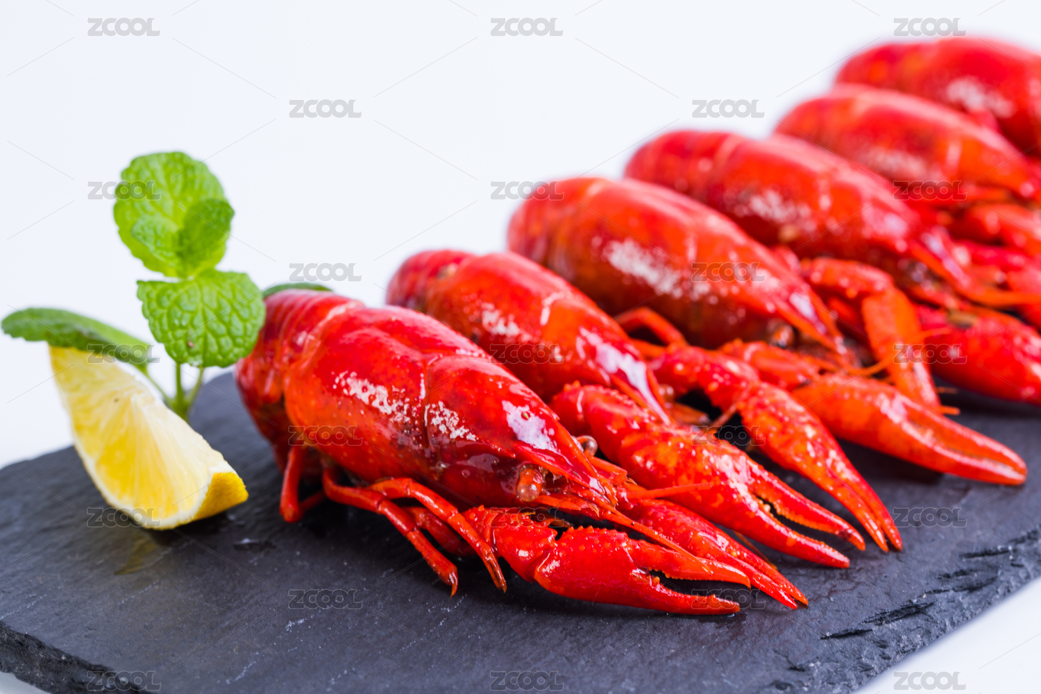 摆放在黑石板上放着白色背景上的美味小龙虾