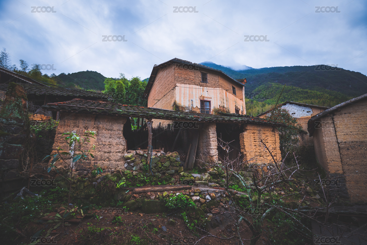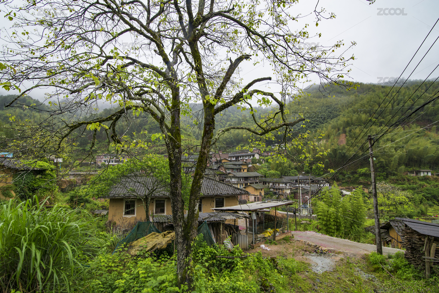 阴天下一棵大树背后的小山村