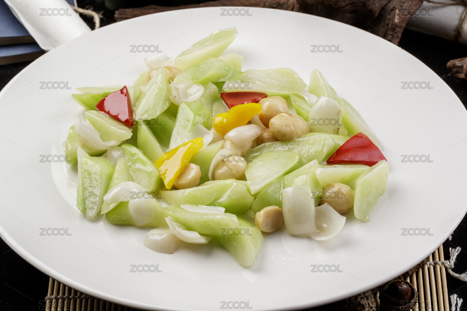 莲子百合炒乳瓜摆放在寿司帘上