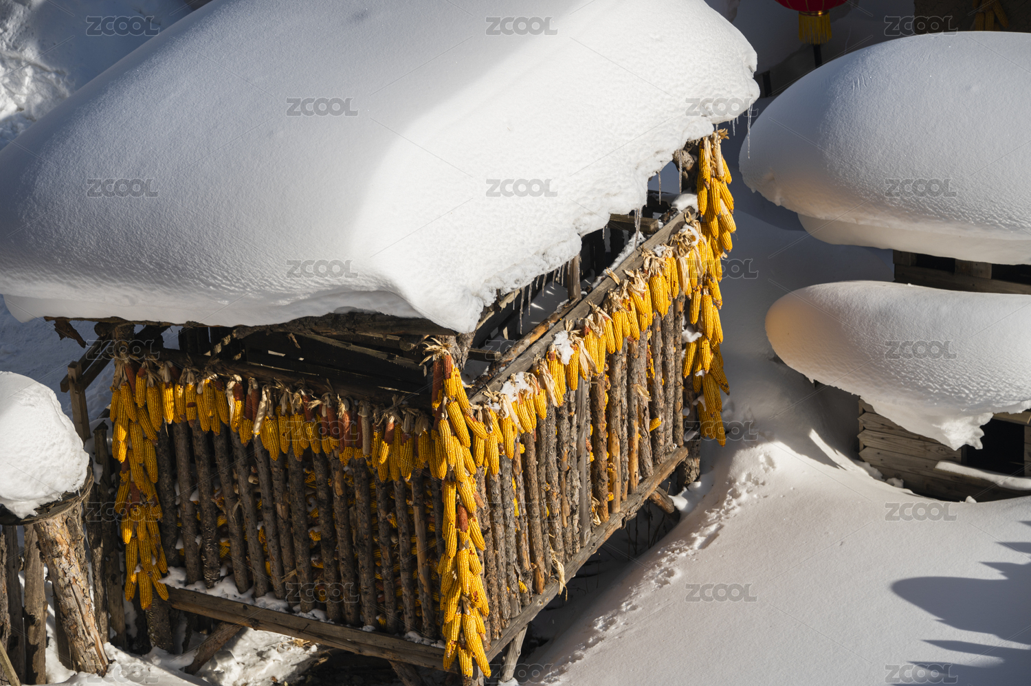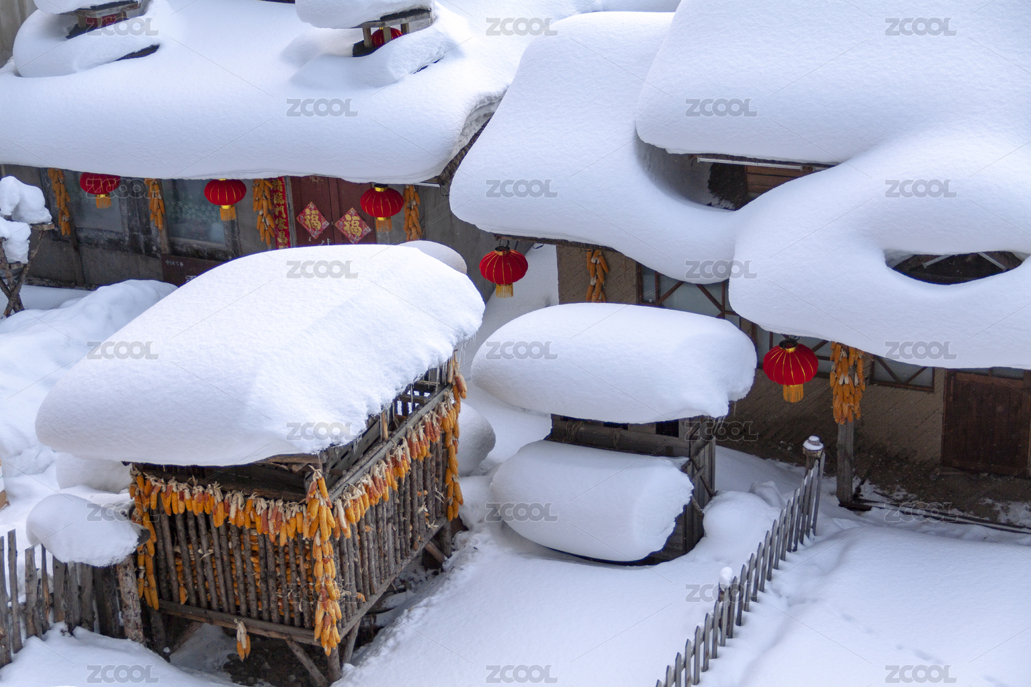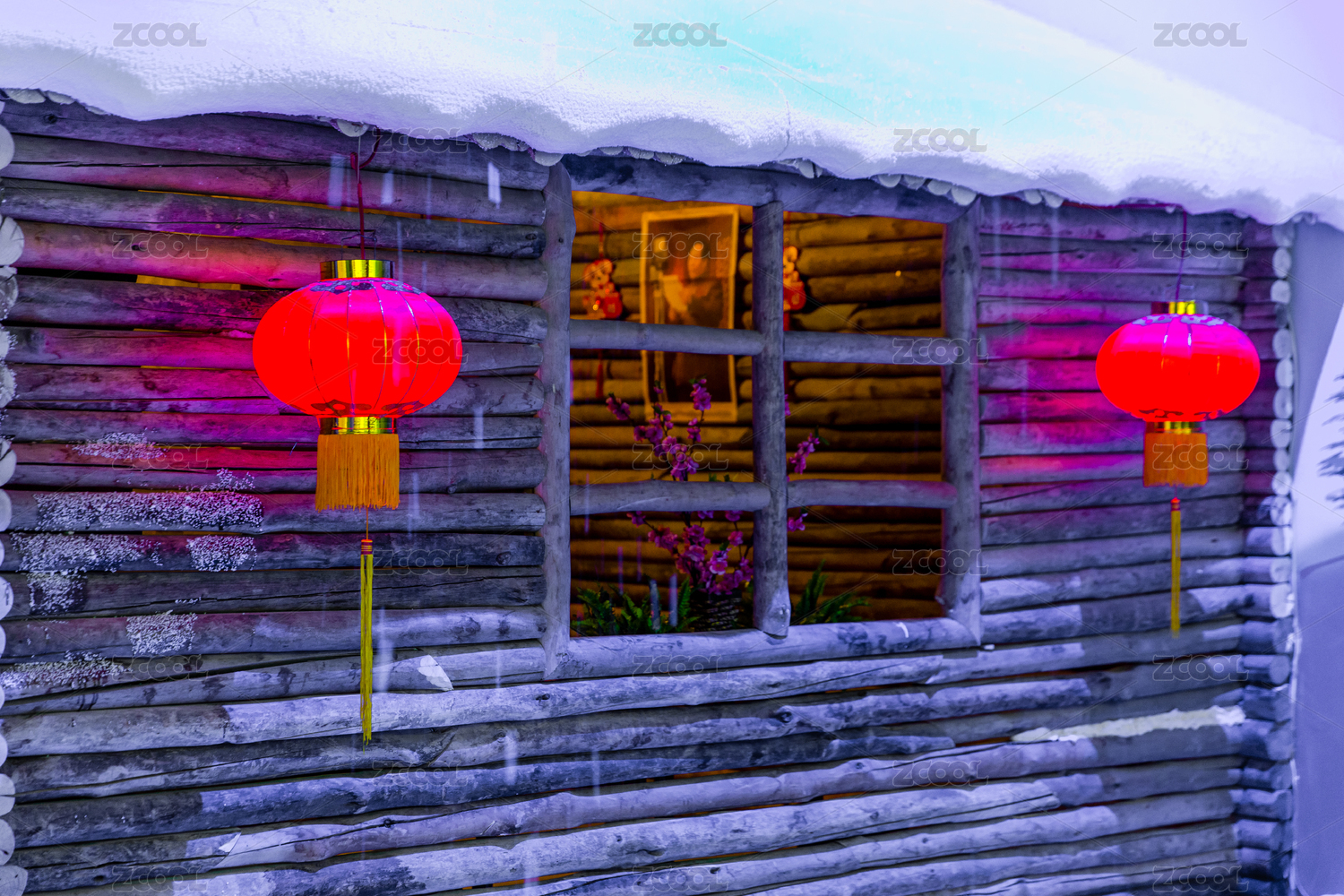 大雪中的红灯笼木屋