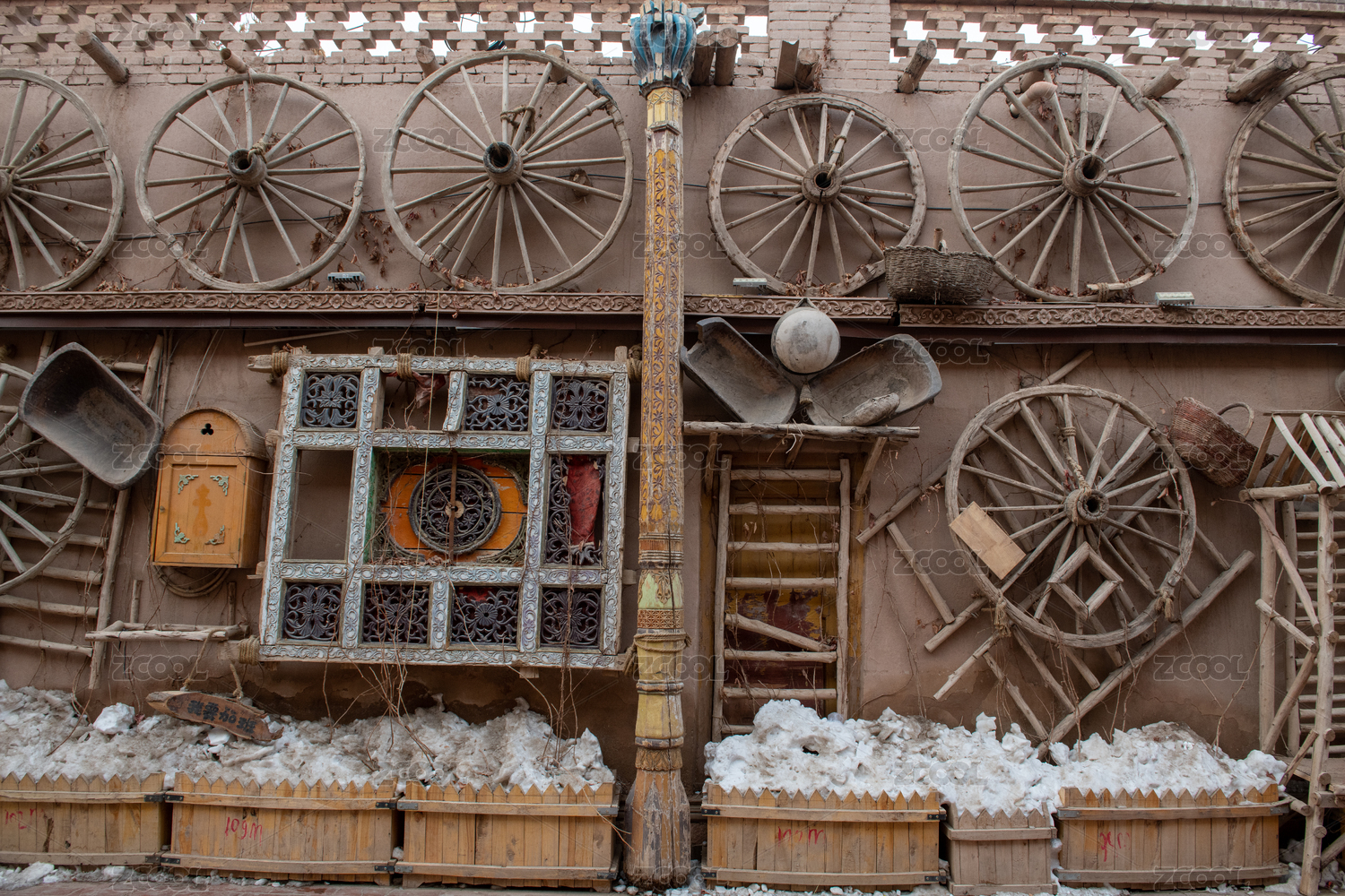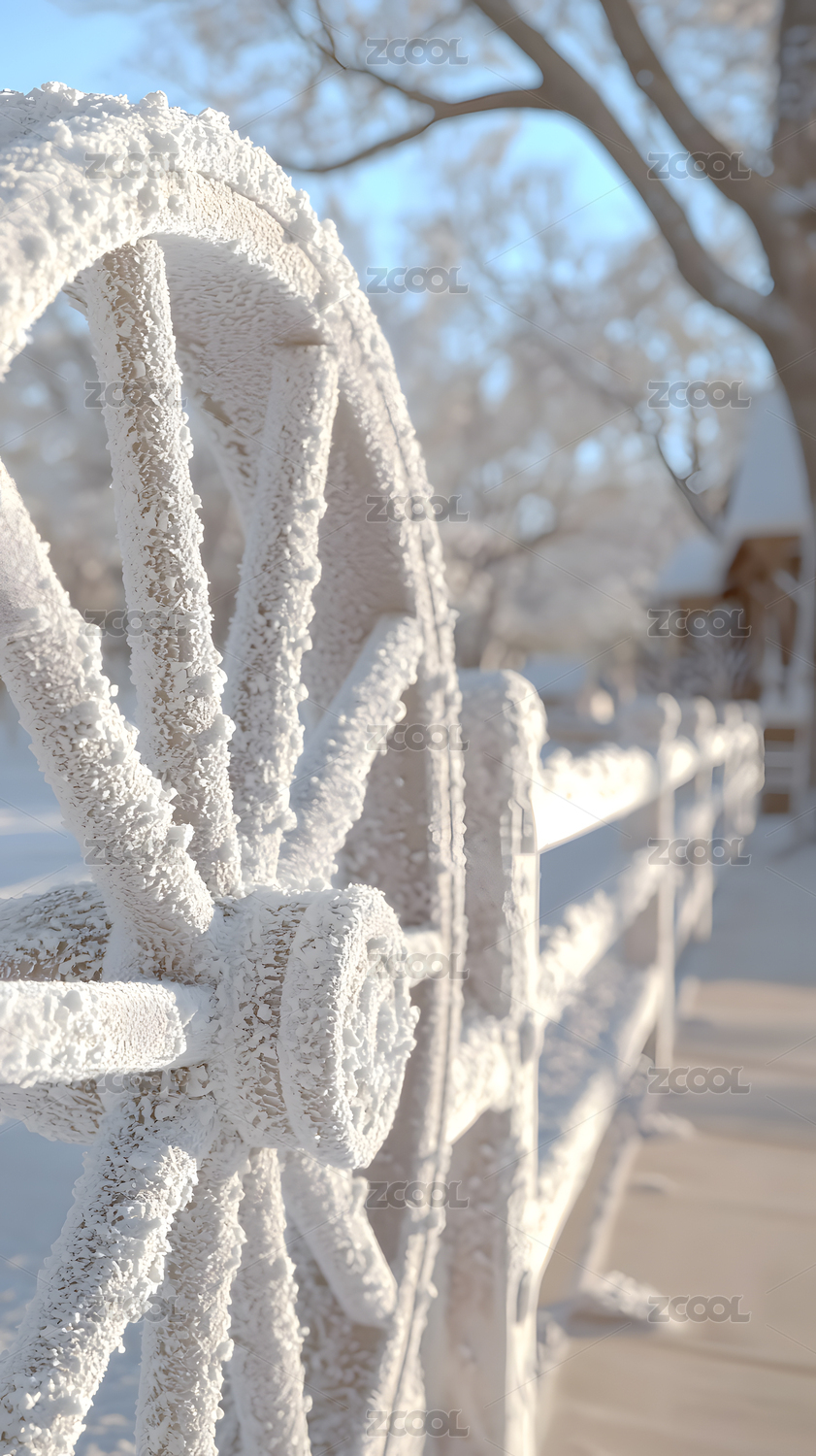 冬季景观中霜冻覆盖马车车轮