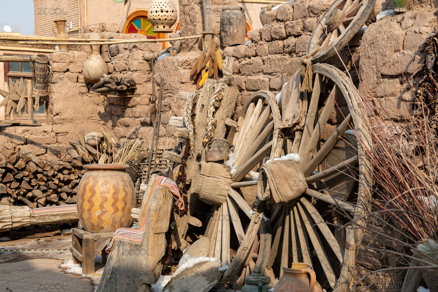 古时用的水桶和石磨碾盘特写