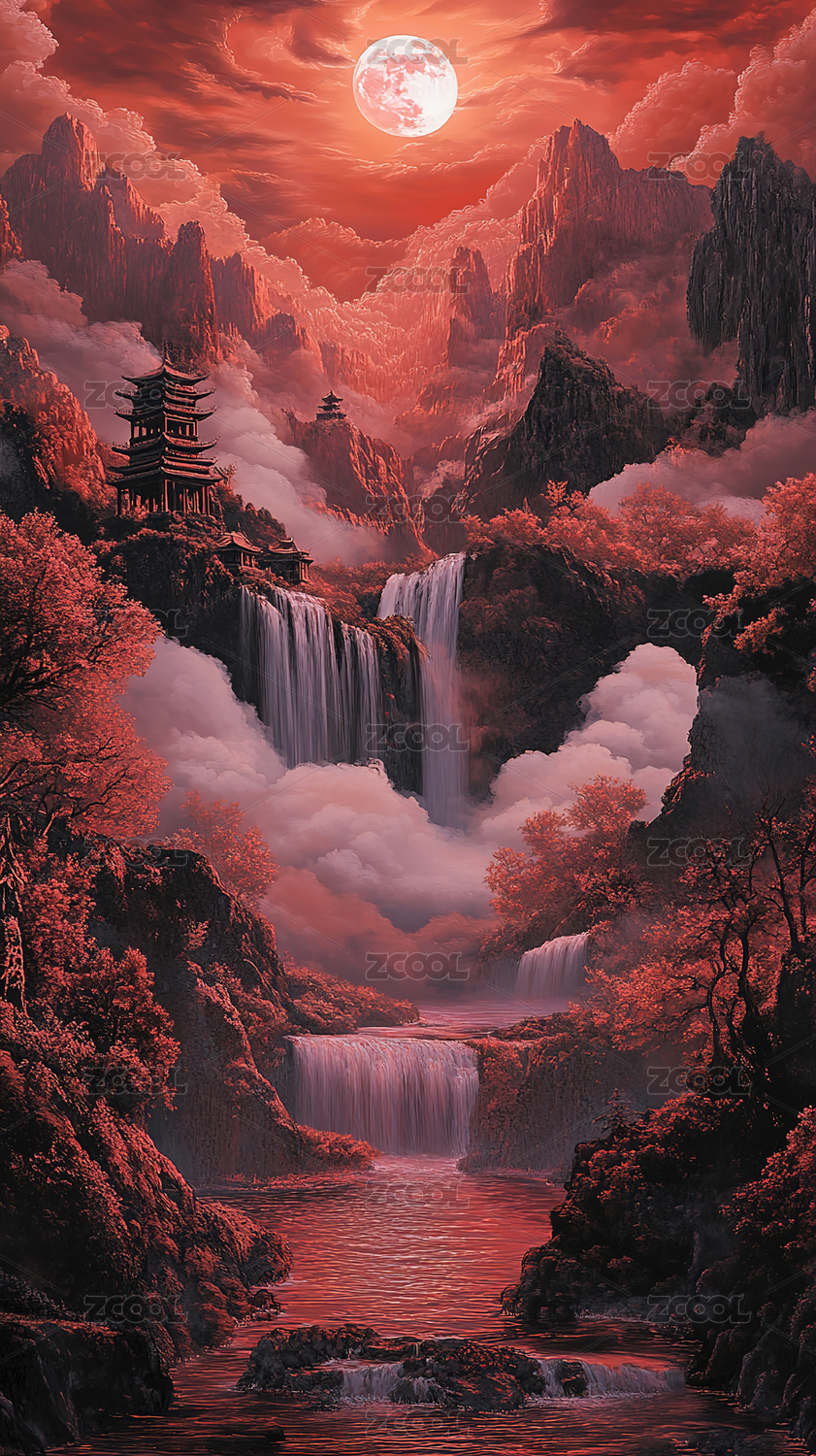 中秋满月下的山川瀑布
