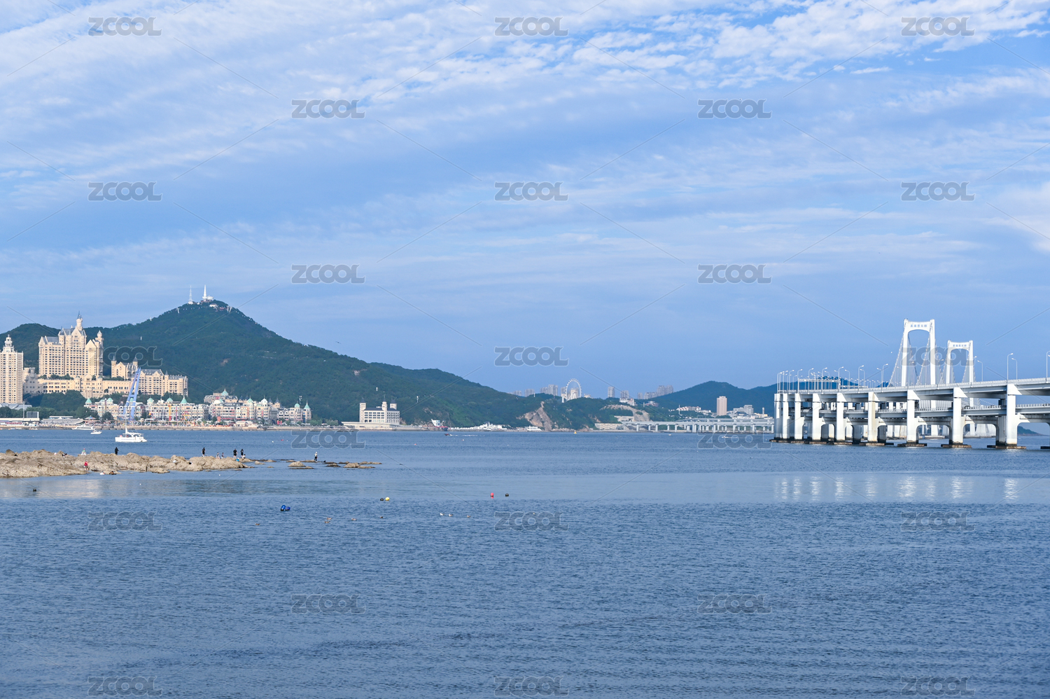 晴朗蓝天下的大连跨海大桥,城市天际线