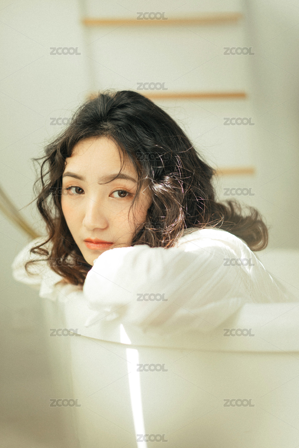 阳光下穿白毛衣的女孩,侧脸特写,绿色背景