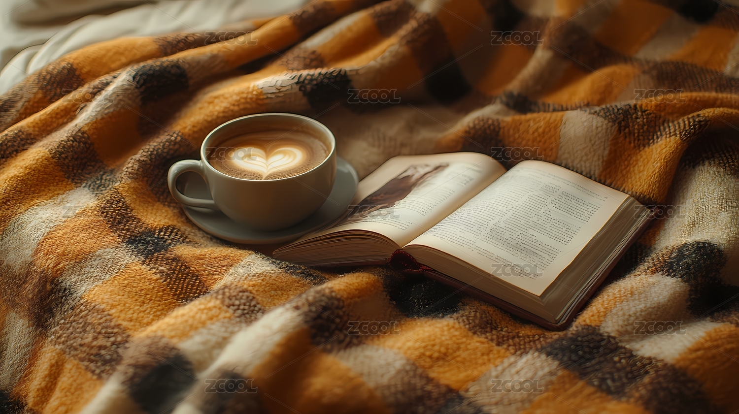 一本书和一杯咖啡放在毛毯上