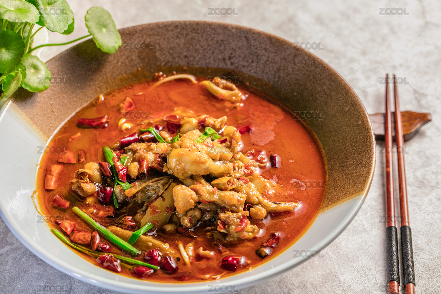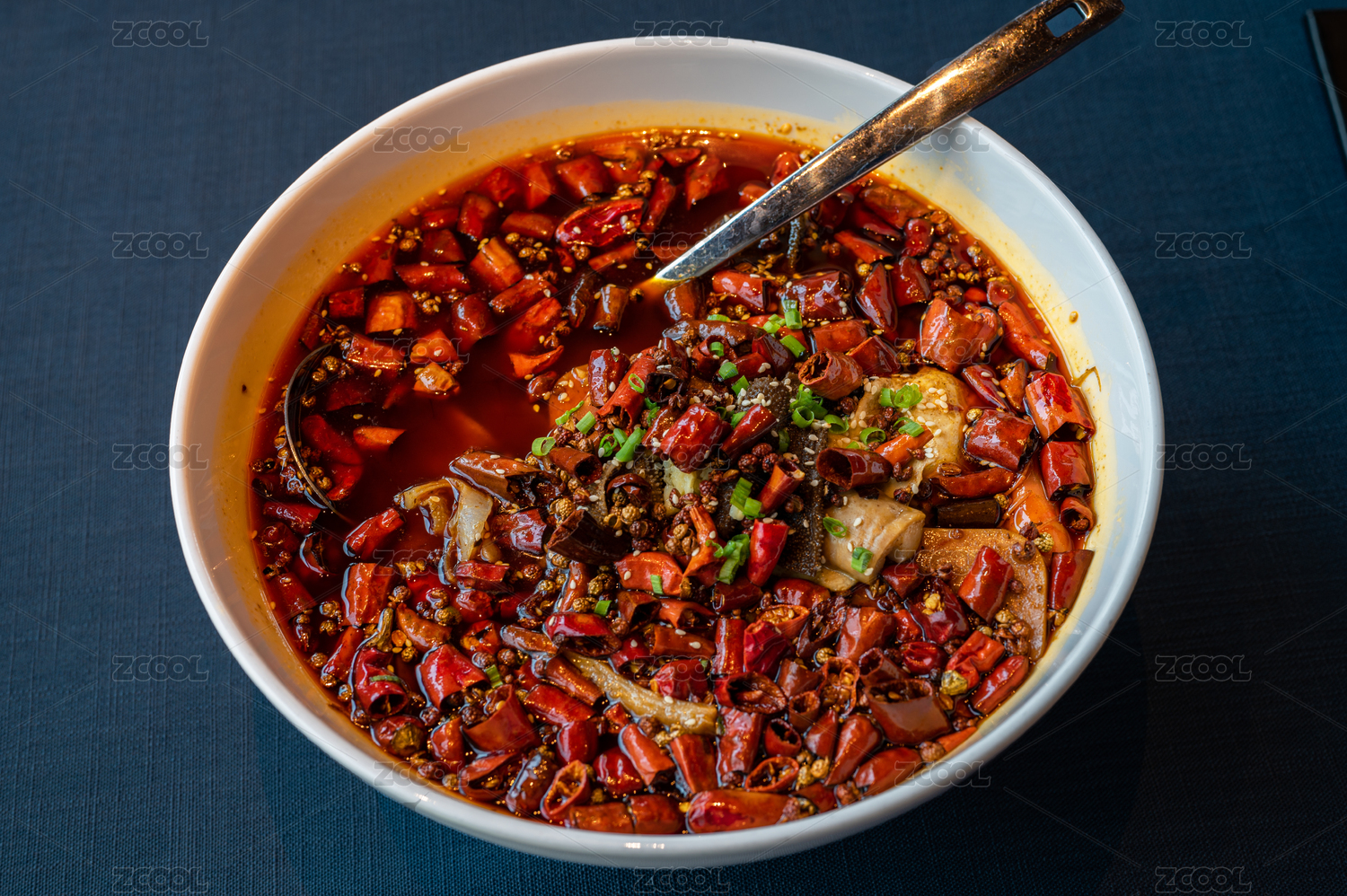 一盆四川特产美食毛血旺,铺满辣椒花椒火辣