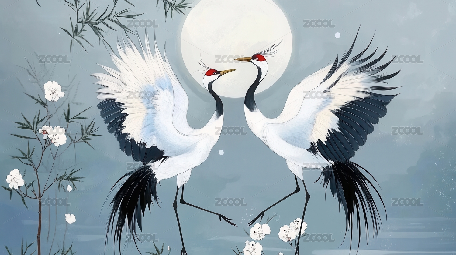 月下双鹤图水墨丹青