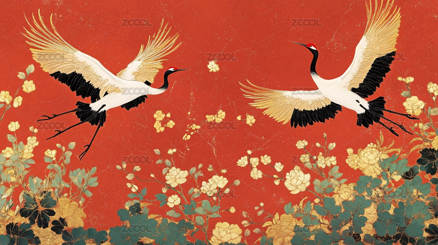 红底金箔飞鹤图
