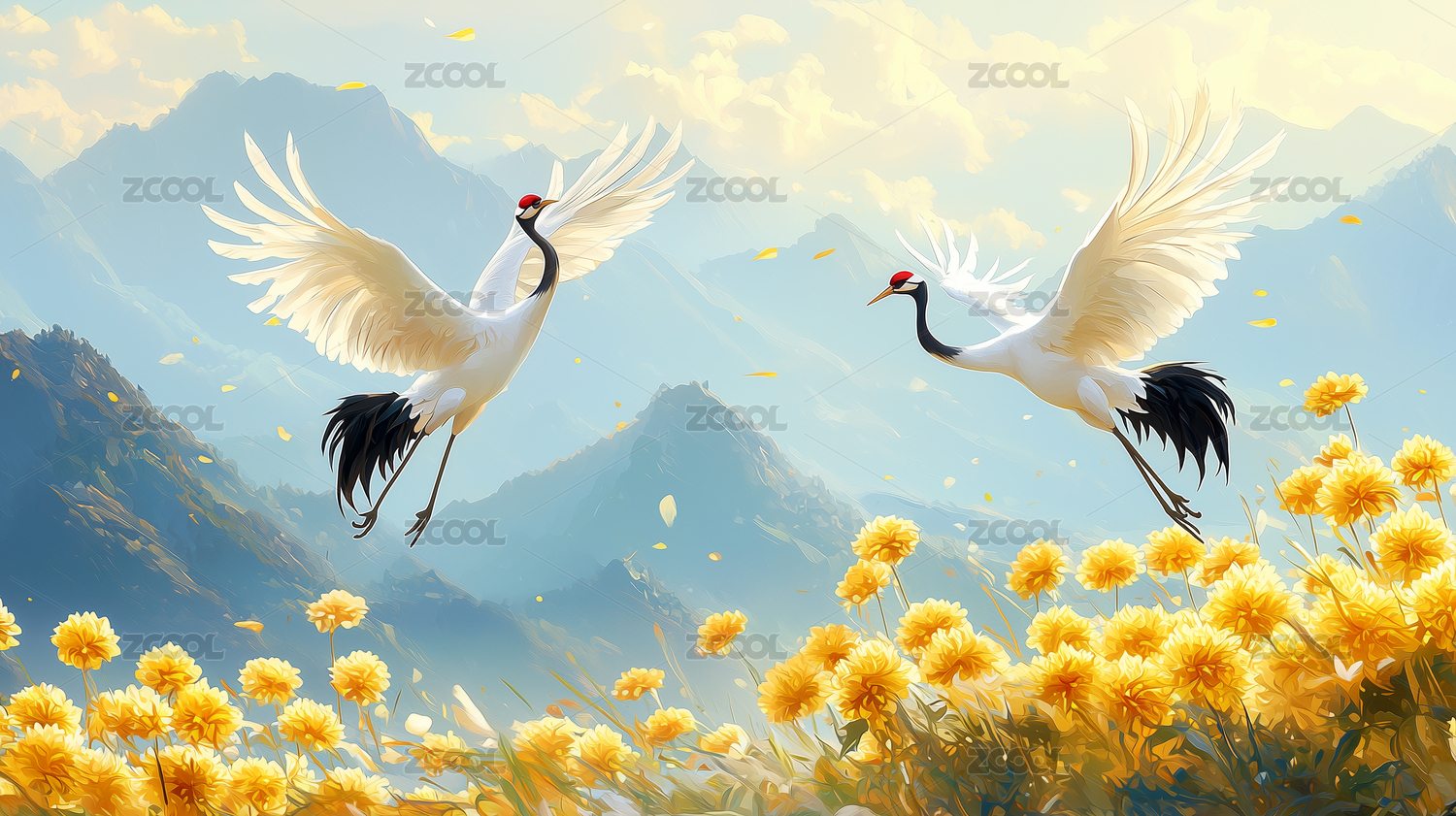 仙鹤迎着落日天空飞翔,伴有金色菊花