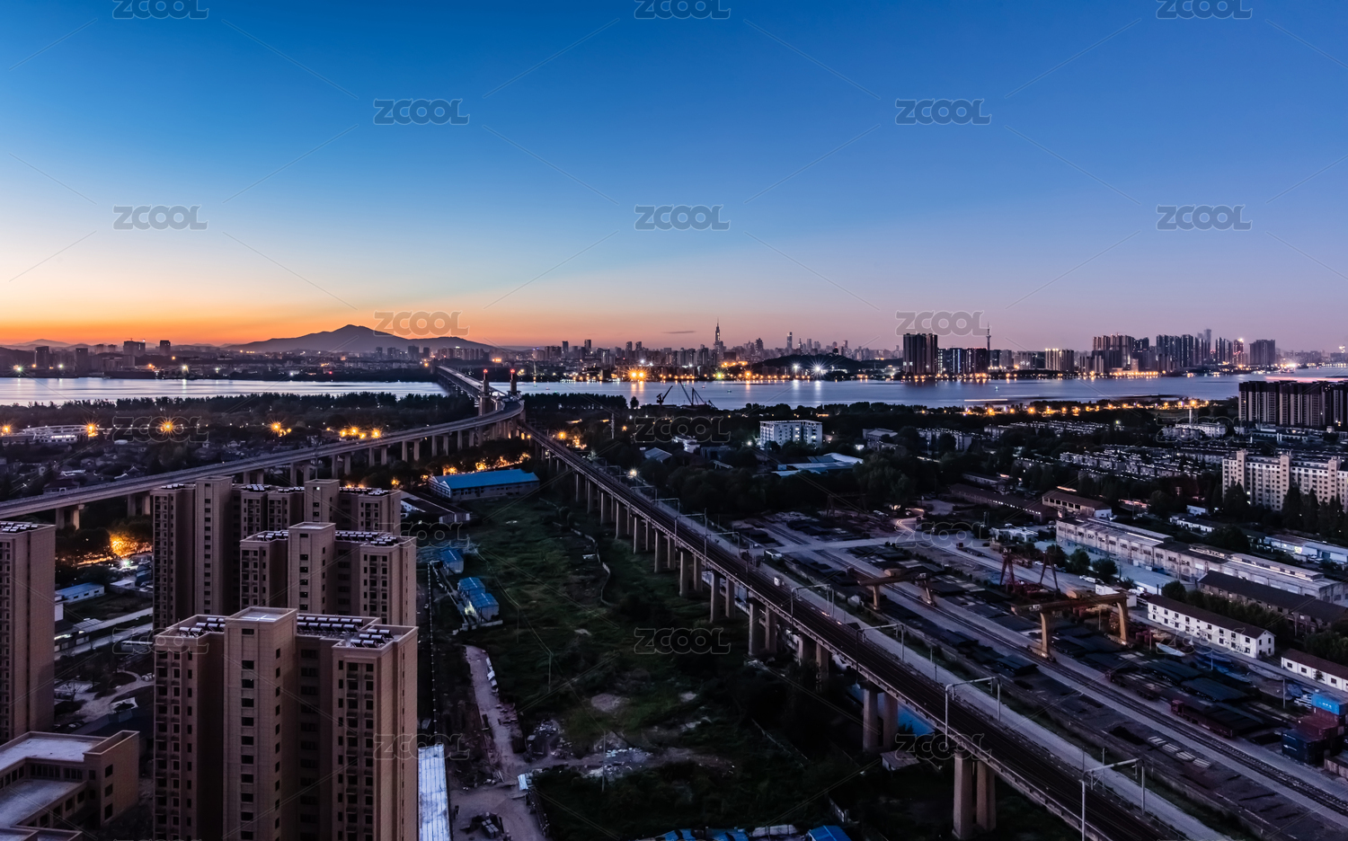 江苏省南京市长江大桥外滩黄昏都市高楼建筑