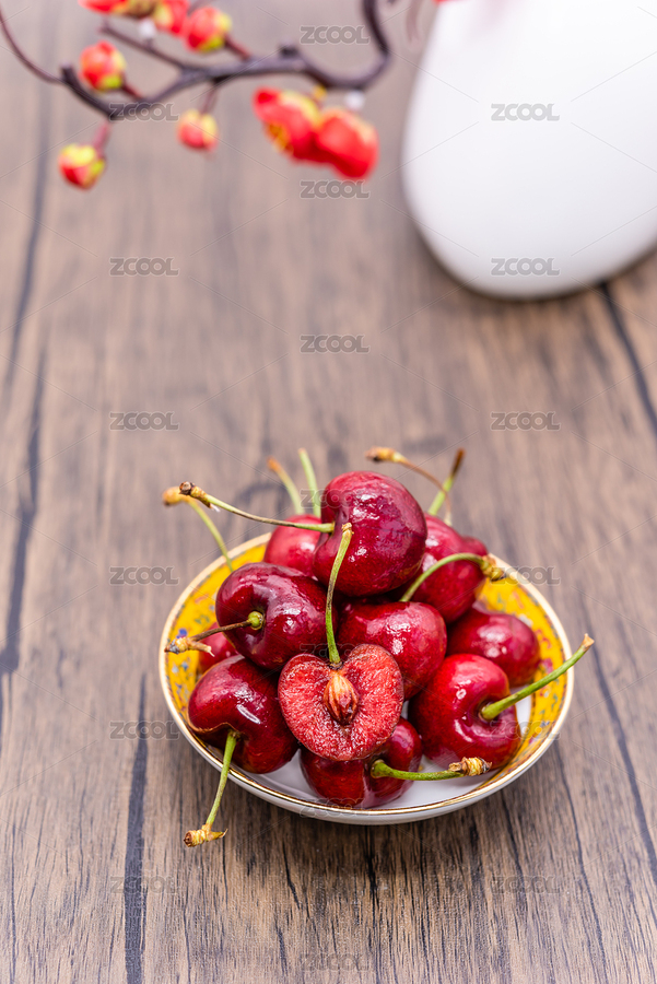 樱桃,车厘子,水果,棚拍,插花,桌面,木桌,一盘,一堆,碟子