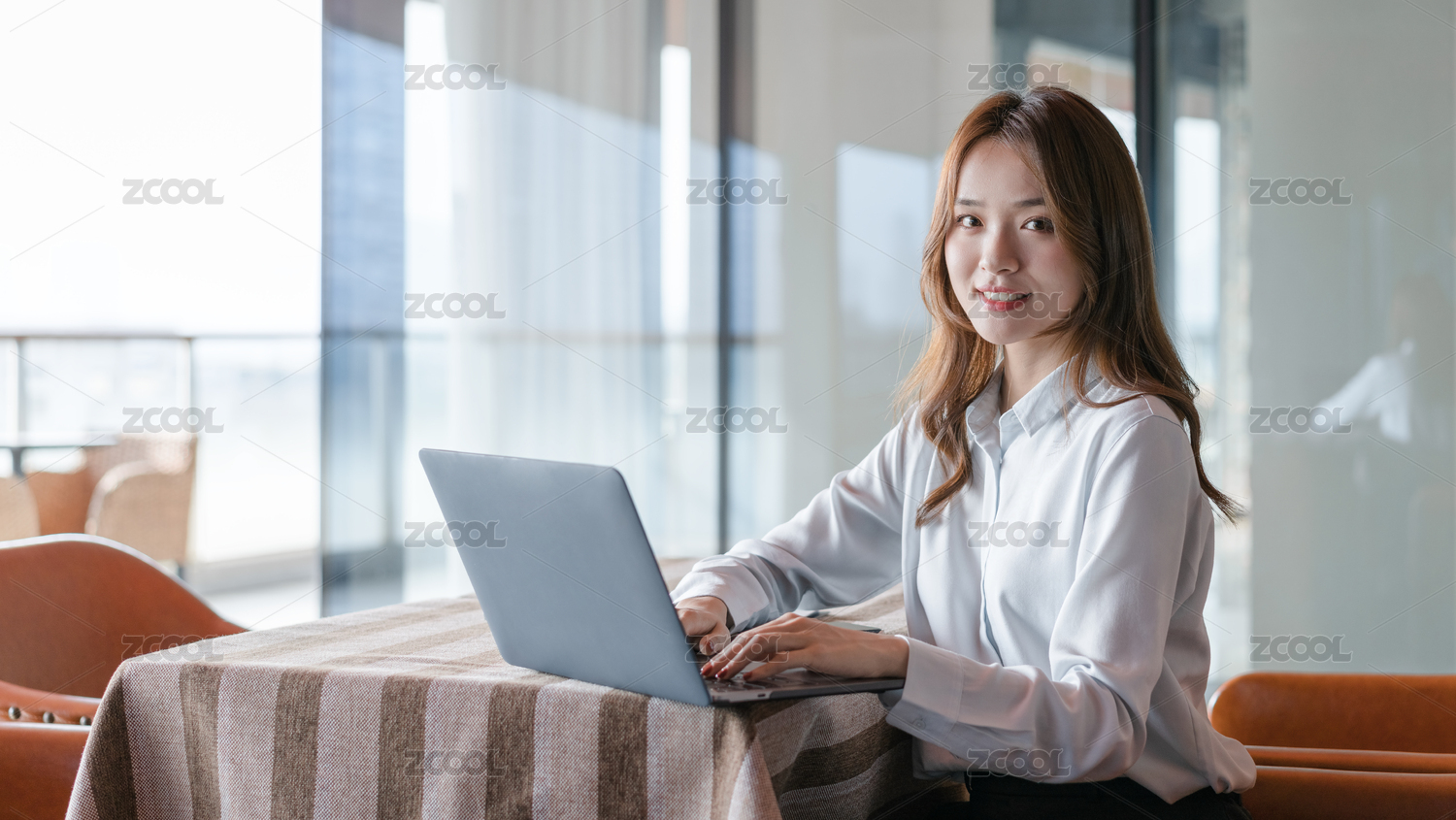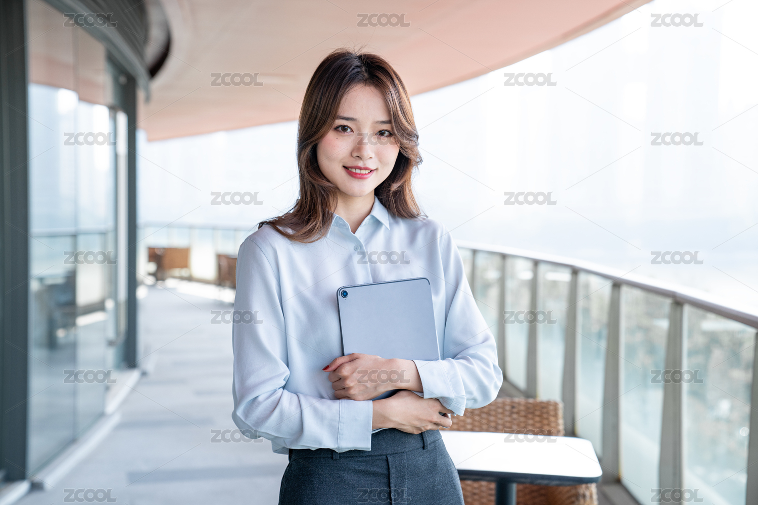 一个中国年轻时尚的职业女性脸带微笑看着平板电脑
