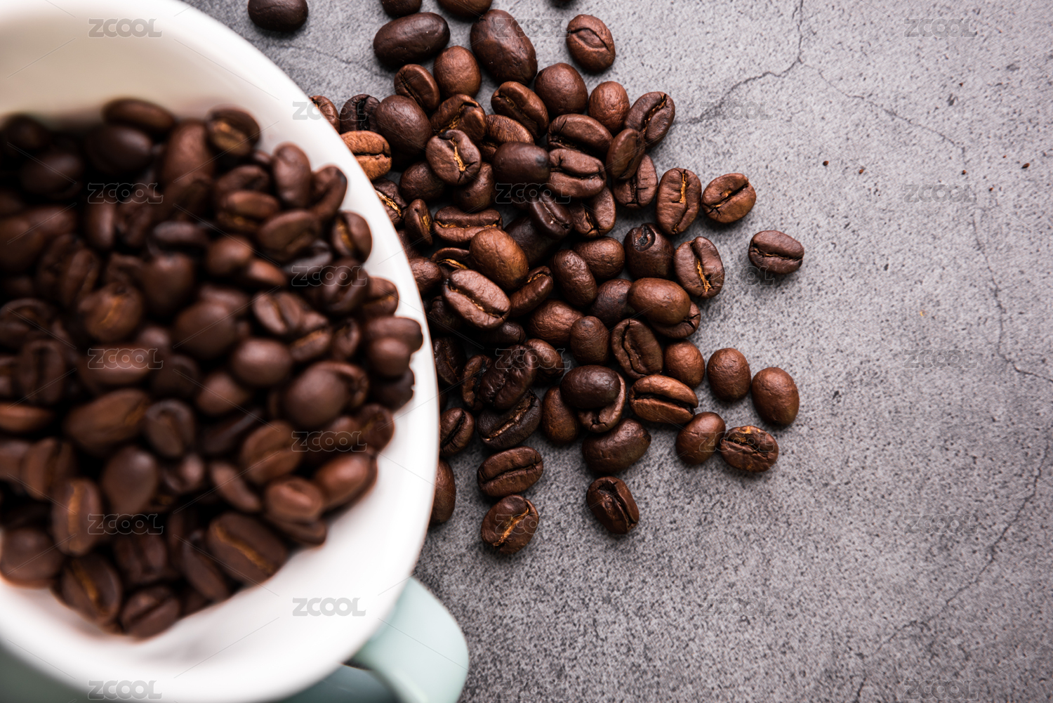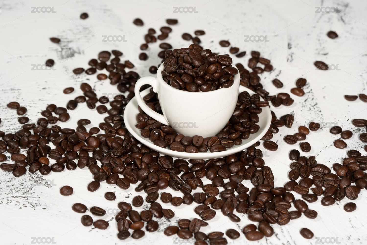 盛满咖啡豆的咖啡杯在铺满咖啡豆的桌面上