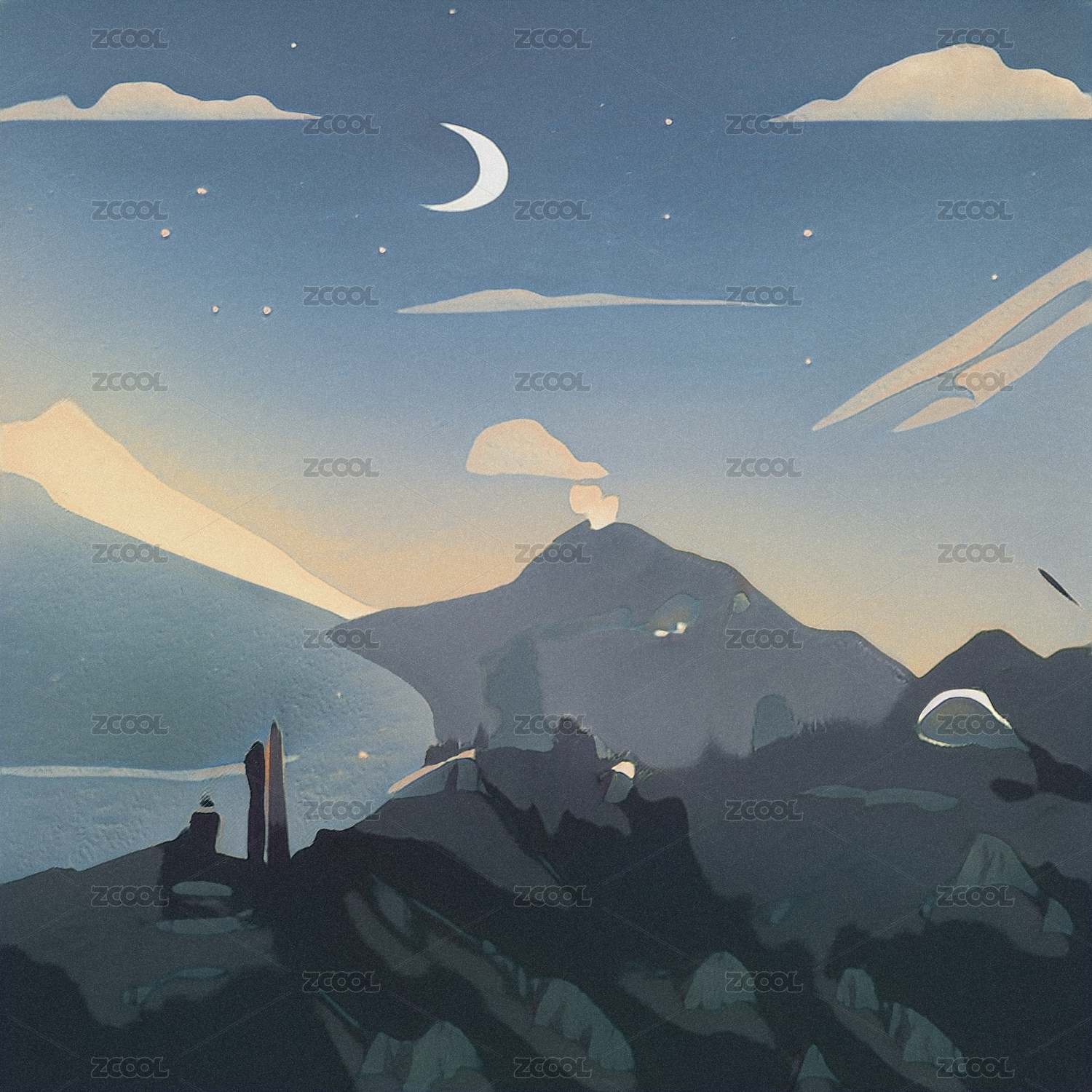 插画,风光,自然,天空,山脉,河流,河,大海,海洋,山丘