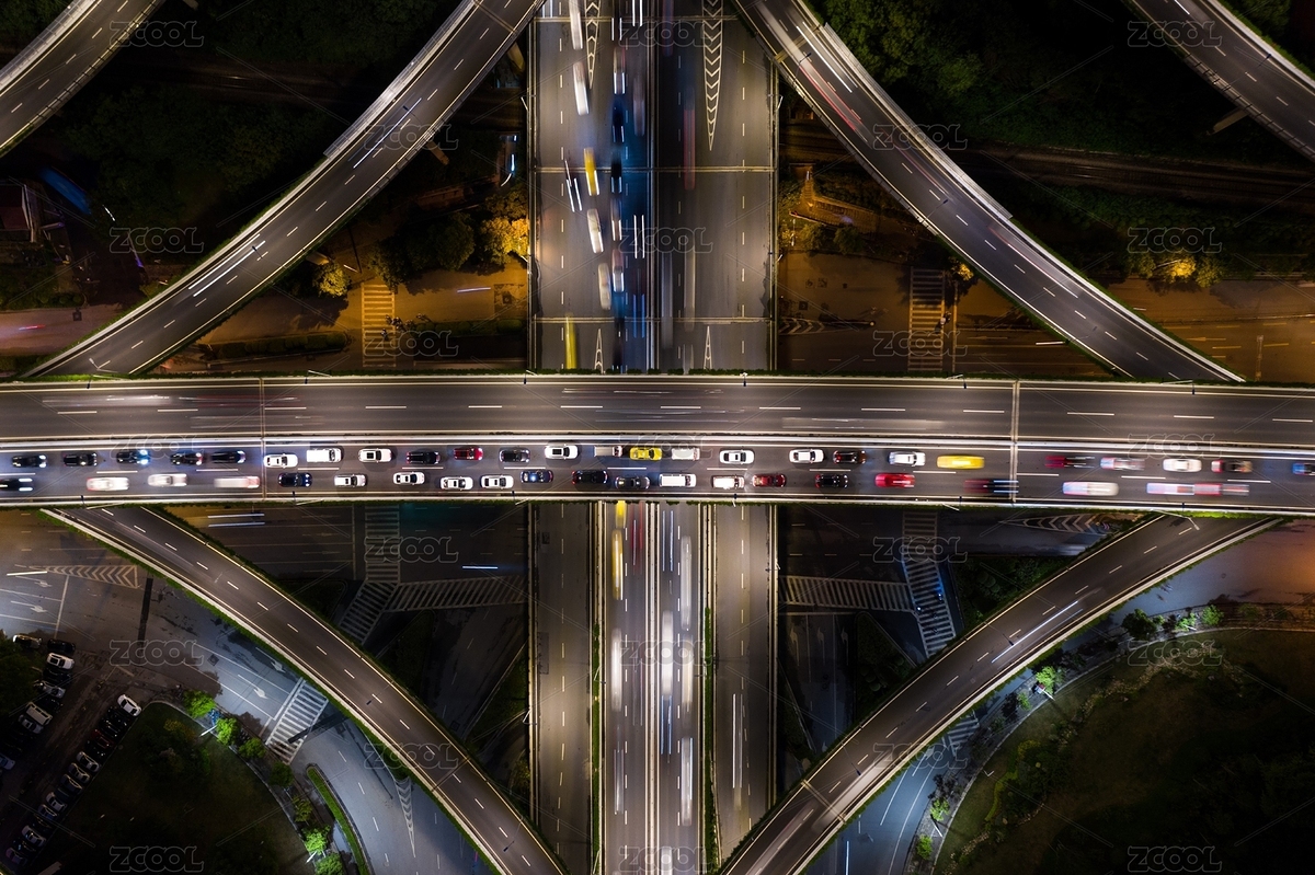 高空视角下的圆形高架桥车流 夜景繁忙交通