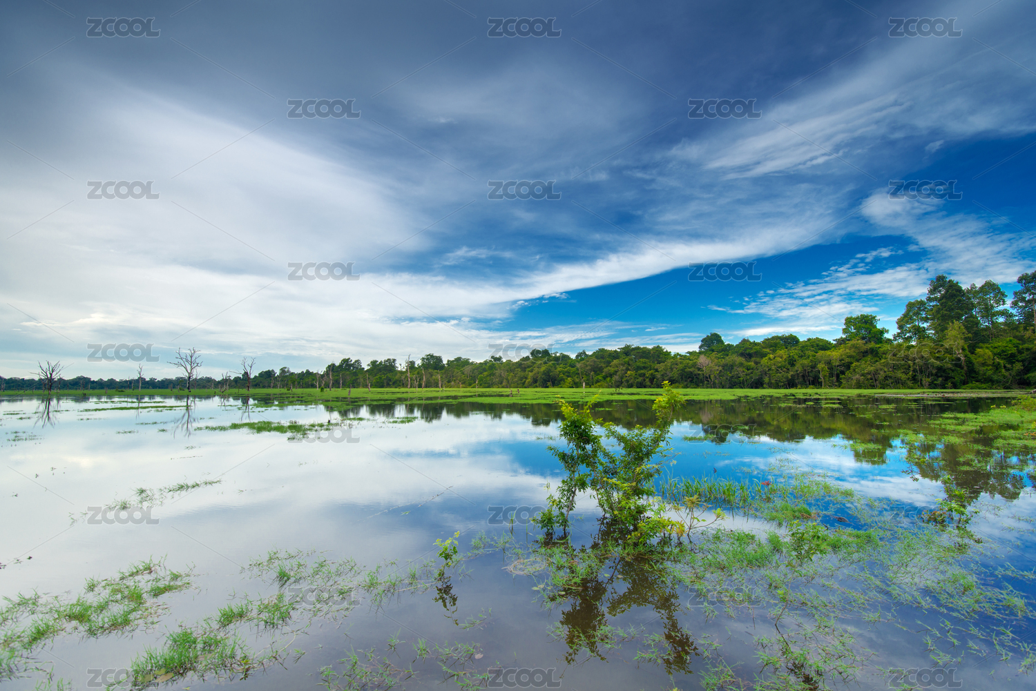 柬埔寨吴哥窟龙蟠水池水中树和蓝天白云的美丽倒影