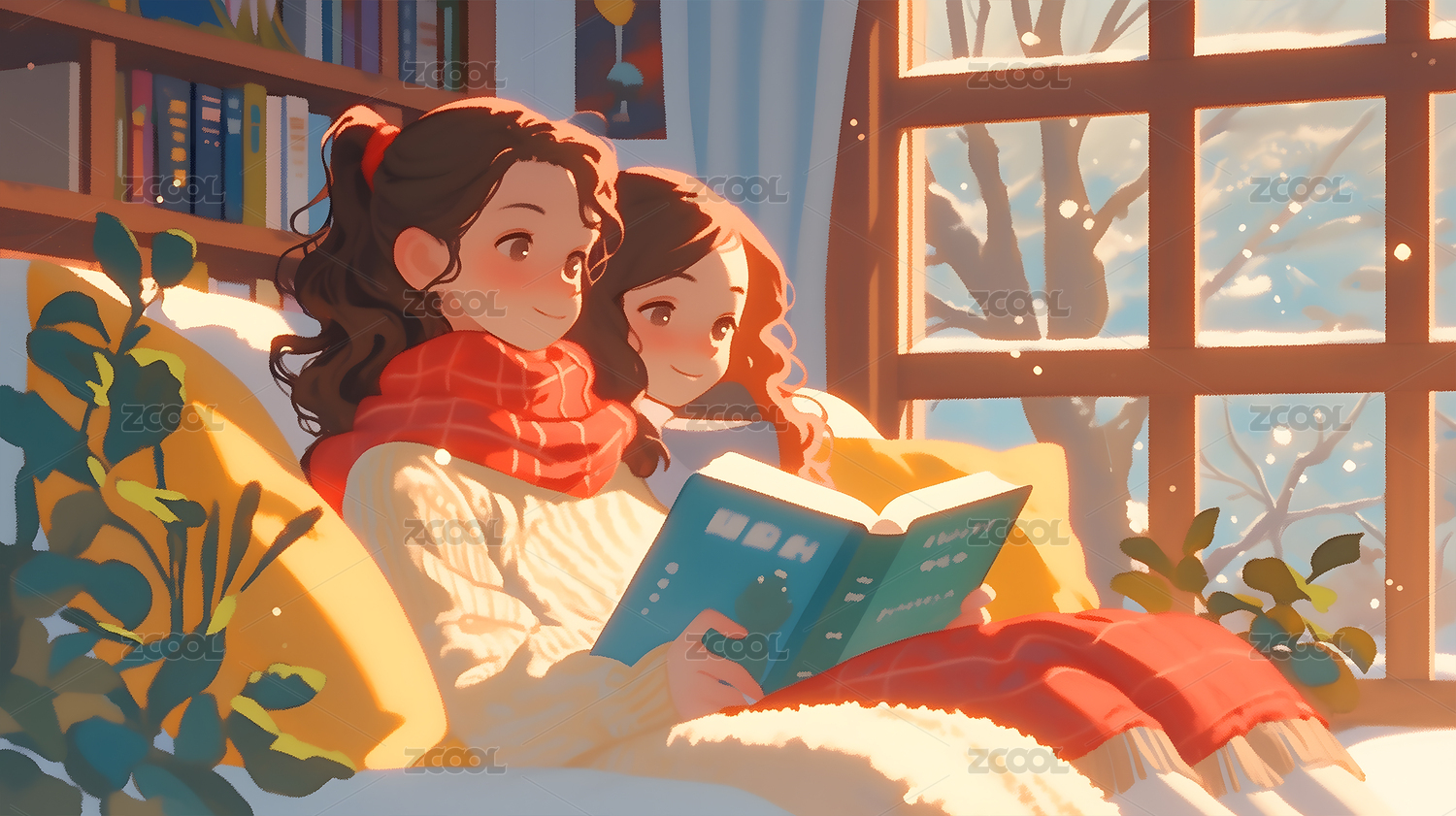 女孩在窗户边的沙发上看书