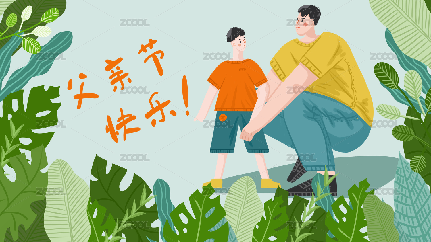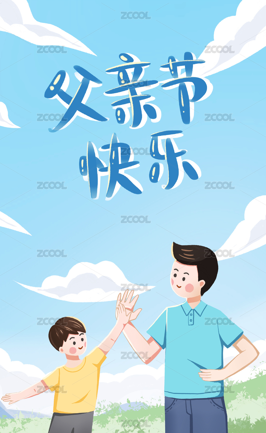 爸爸儿子击掌庆祝父亲节 手绘插画