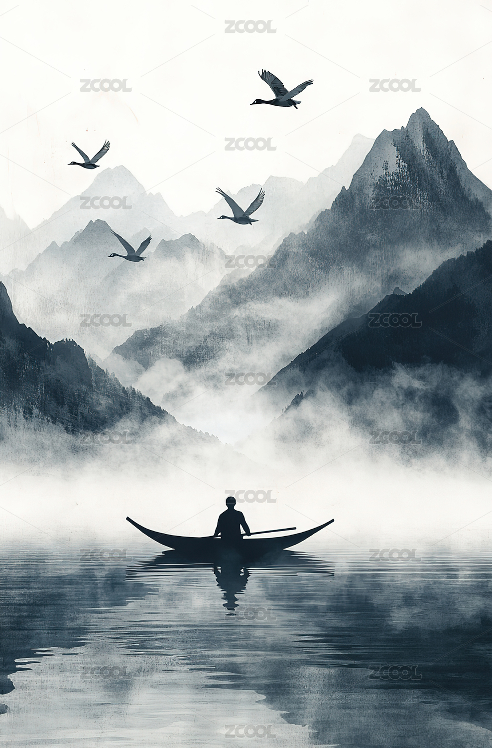 中国水墨风蓝色山水与小船