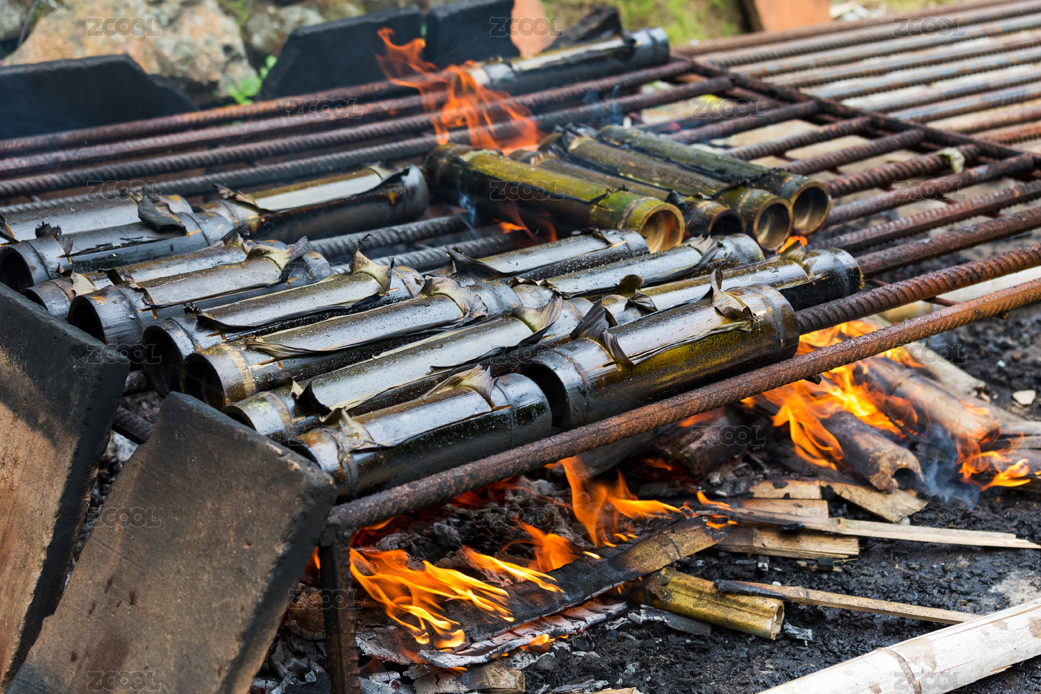 竹子,烹饪,传统,手工制作,食物,户外,火,烟,亚洲,美食