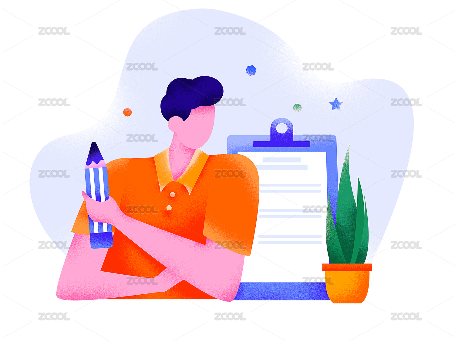 男性背着包拿着文件花草找工作插画