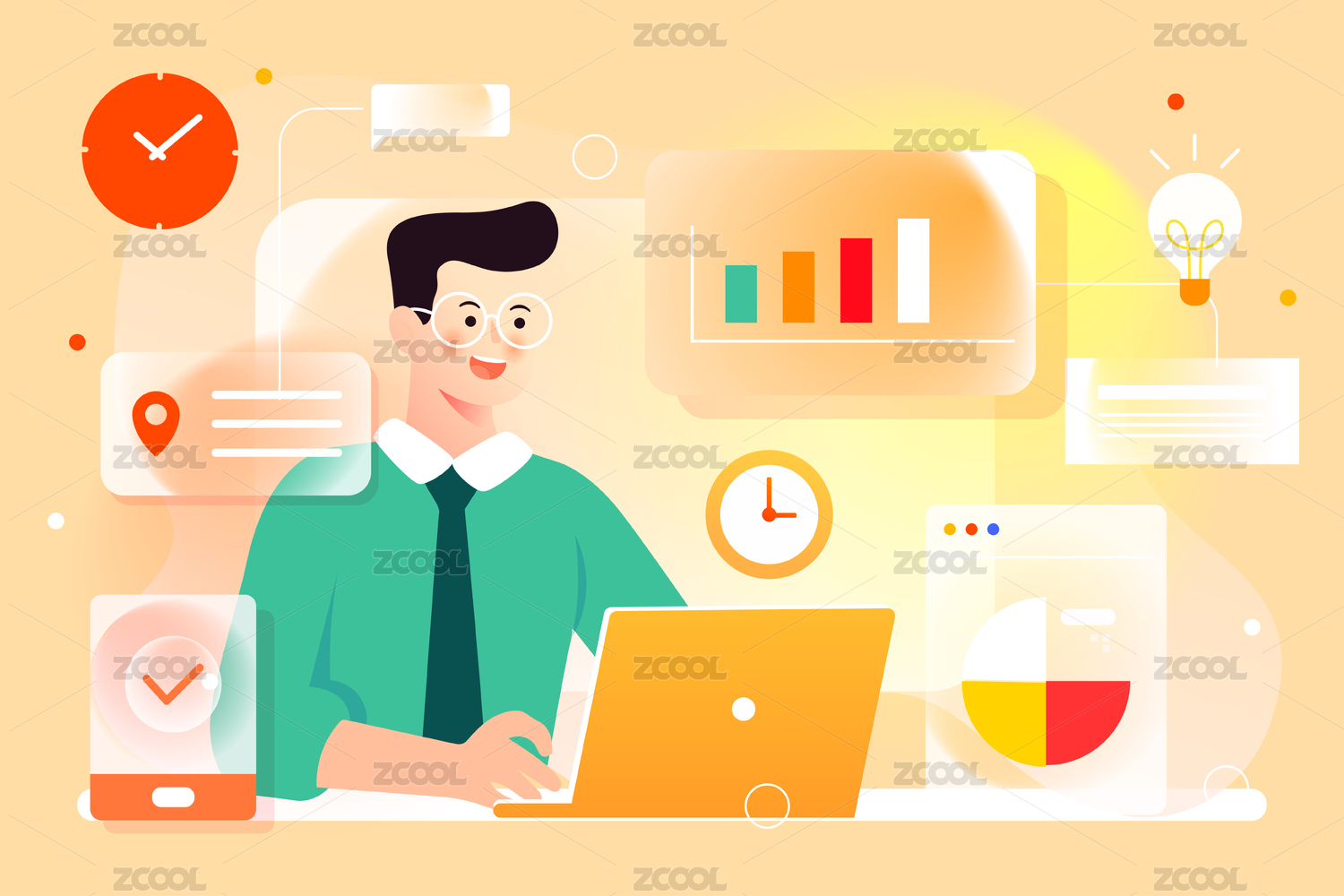 工作中的白领远程协作提高效率,矢量扁平概念清新插画