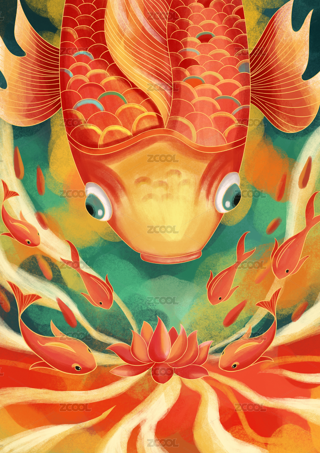 传统中国风荷花锦鲤手绘插画