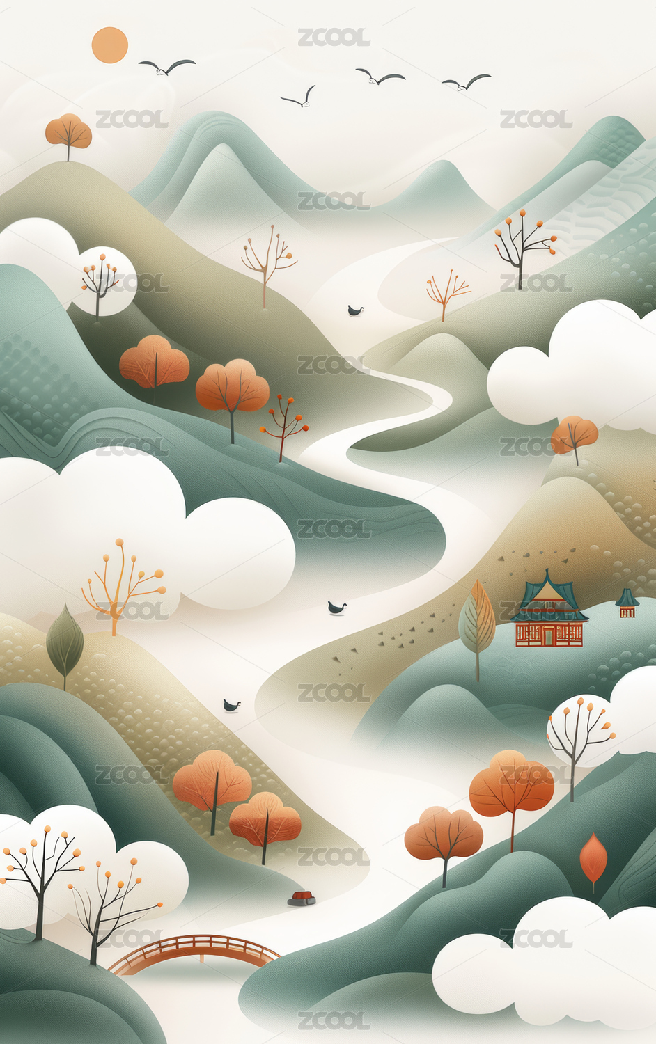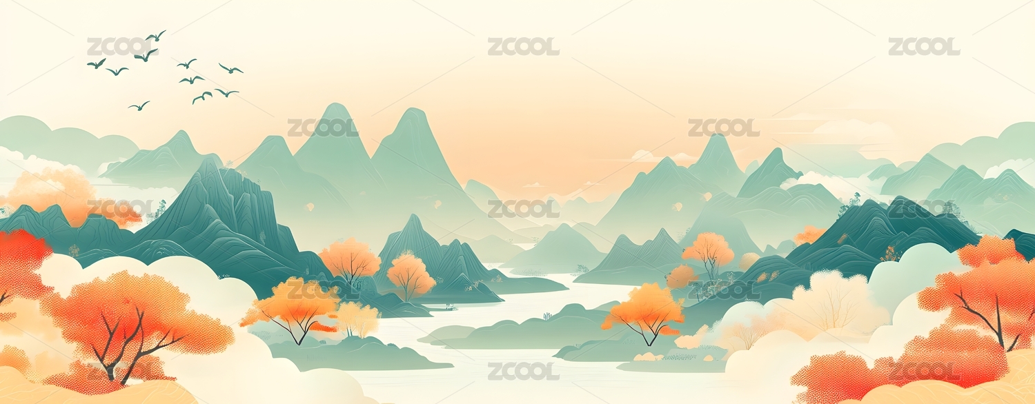 青山和祥云国潮插画