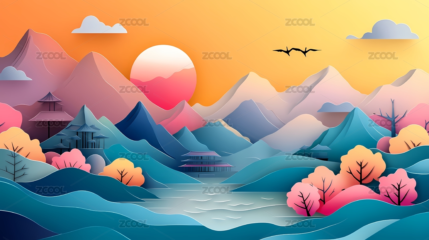 传统中国风景纸雕艺术插画海报背景