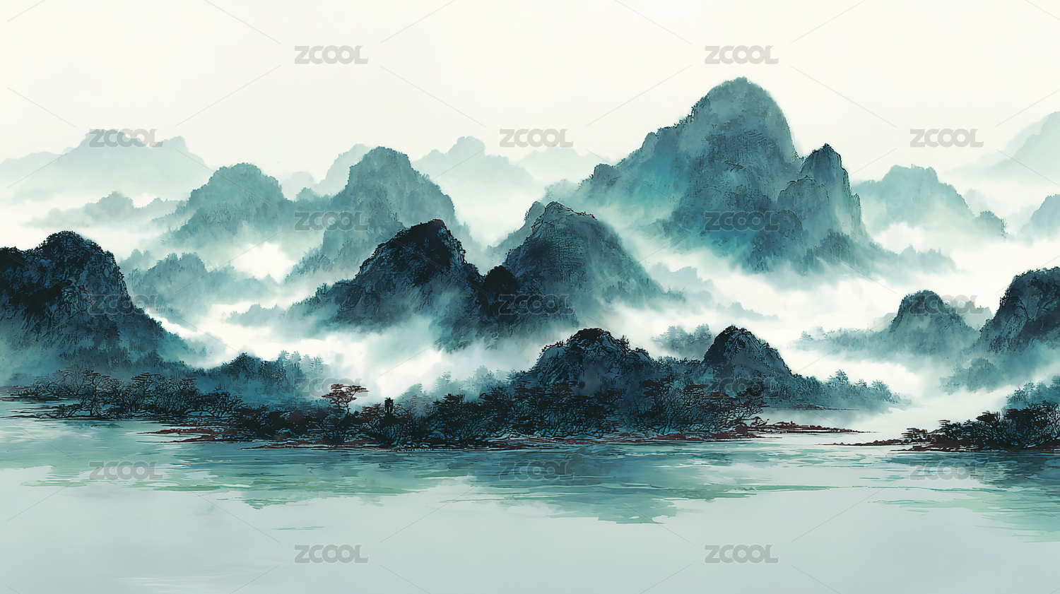 单色蓝色水墨中国风建山水云雾插画壁纸场景