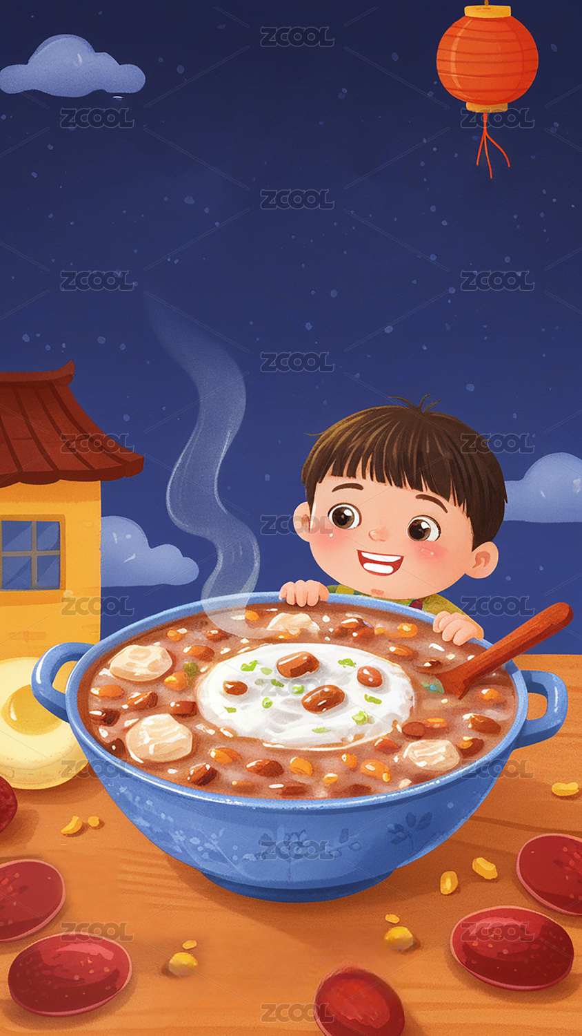 冬天小孩和鸡趴窗外看见一碗腊八粥和水仙花