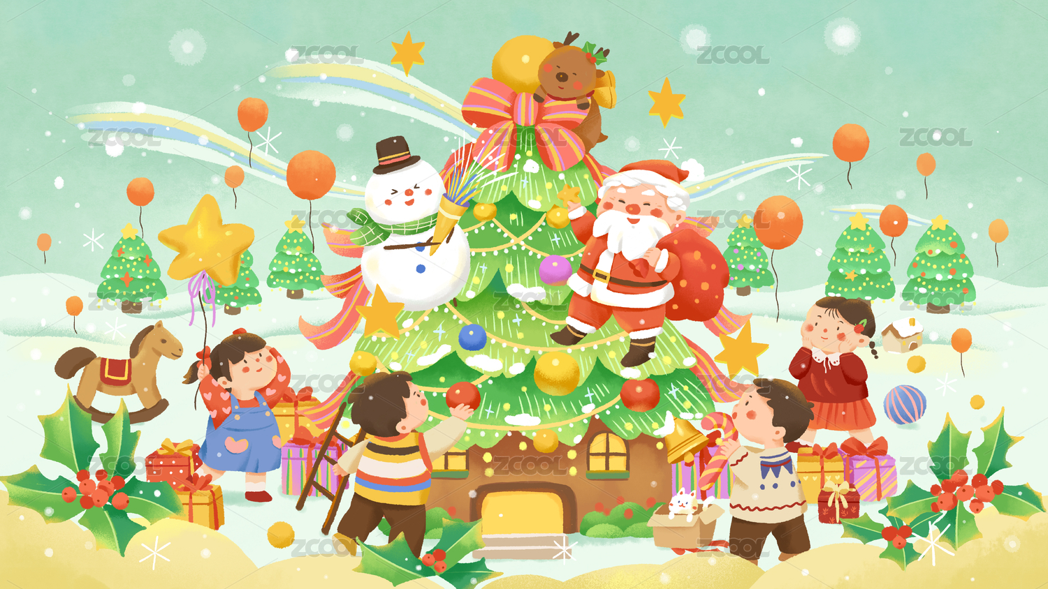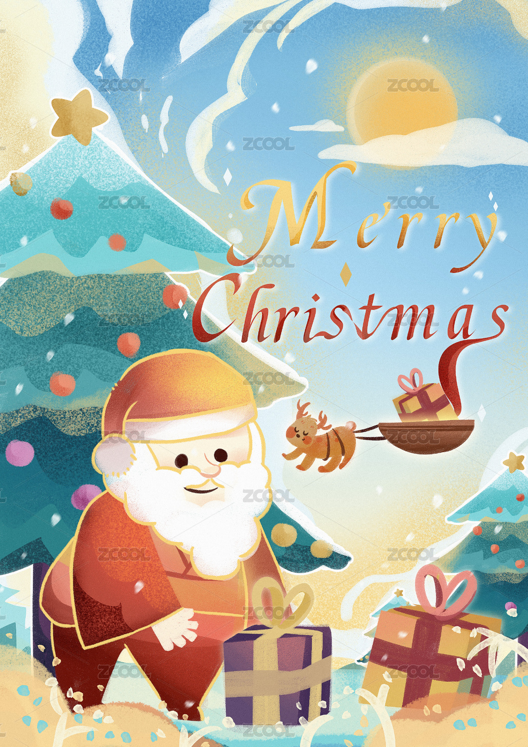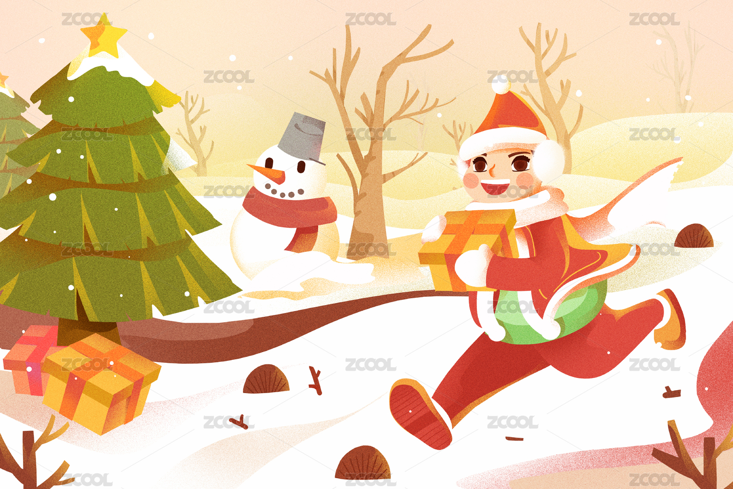 卡通手绘圣诞节唯美风格男孩送礼物开心插画