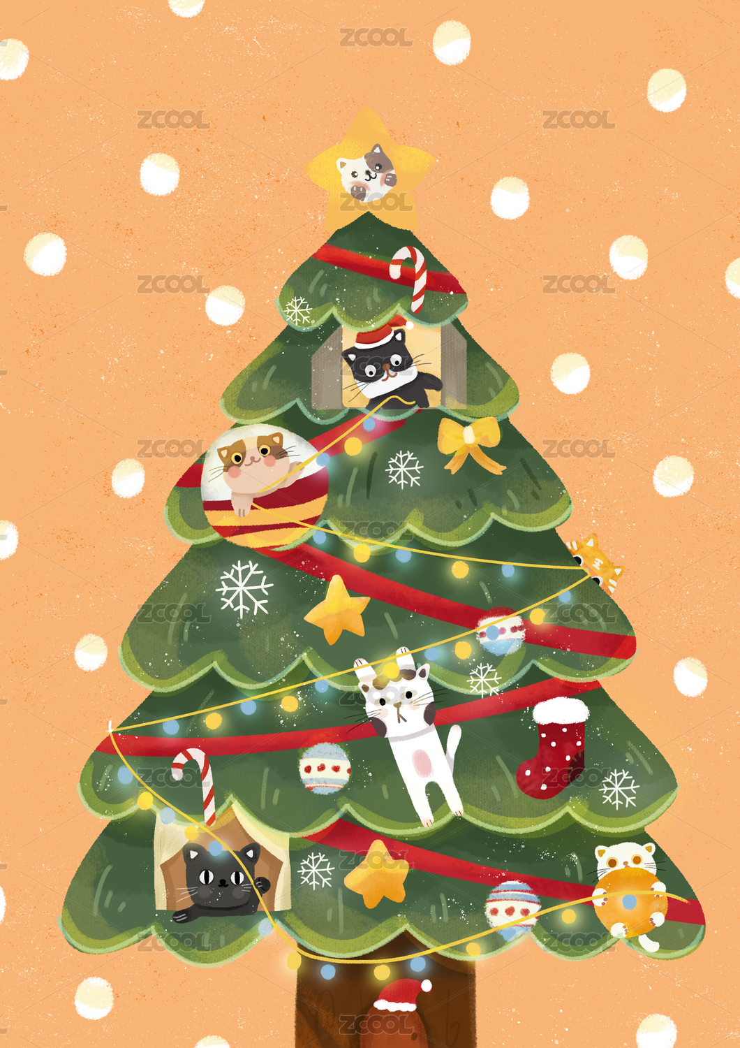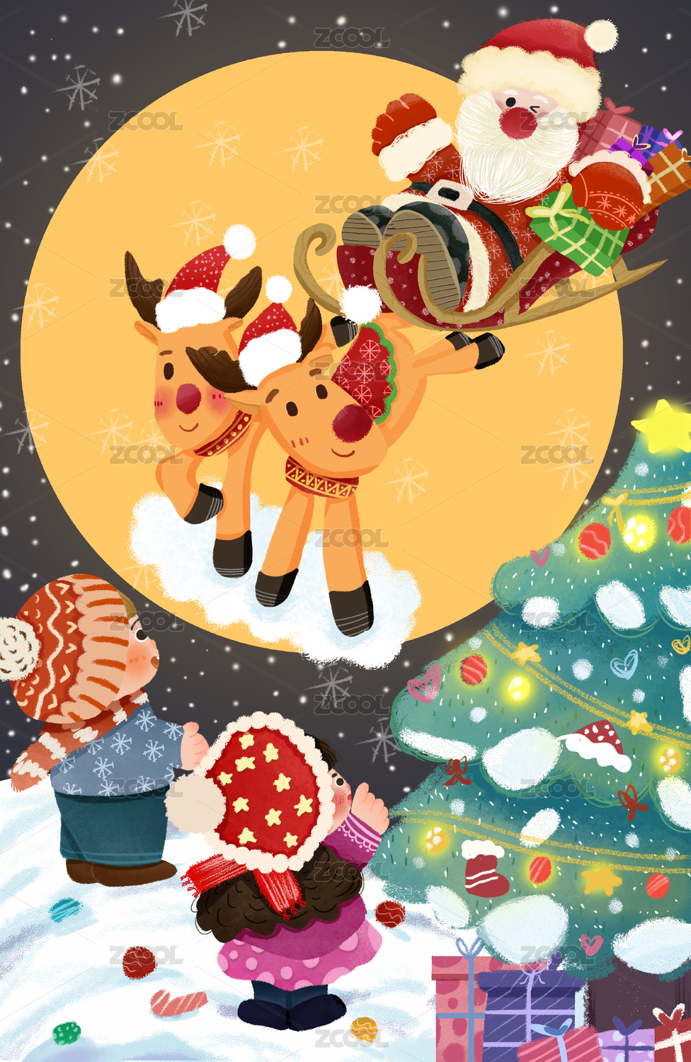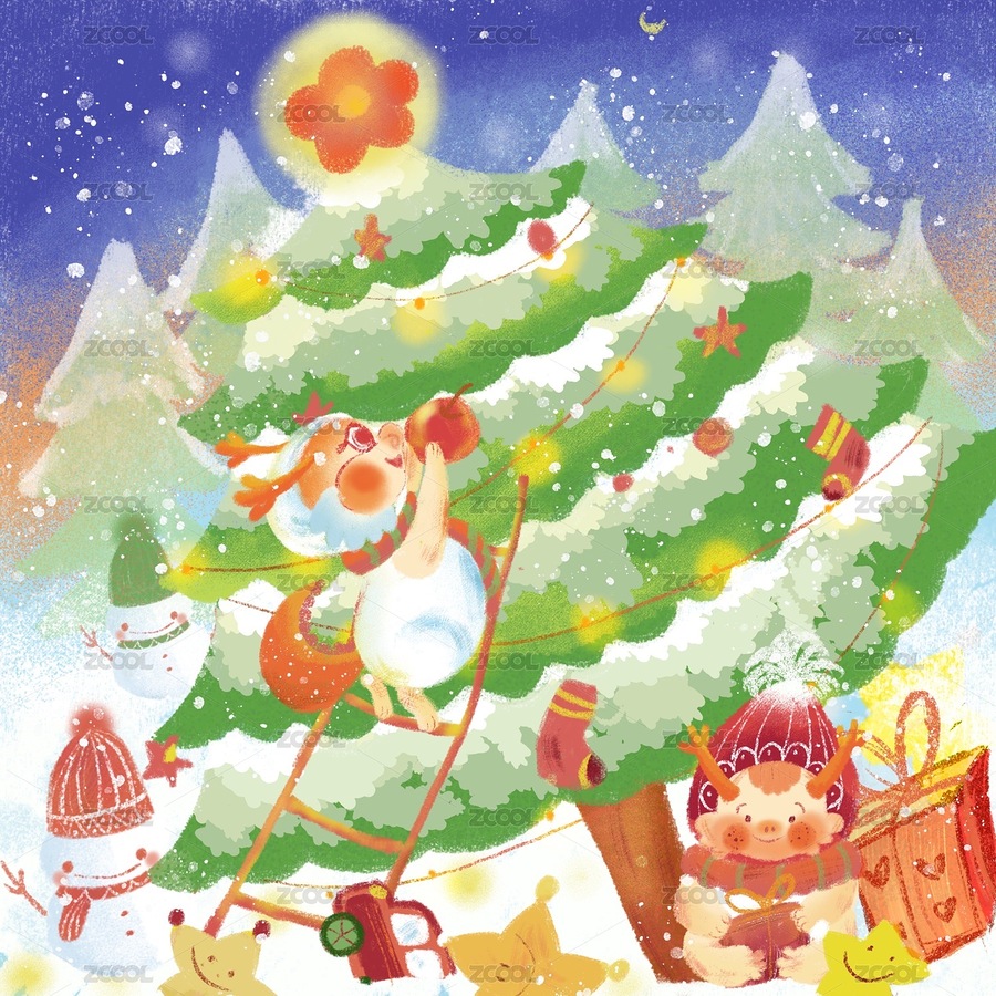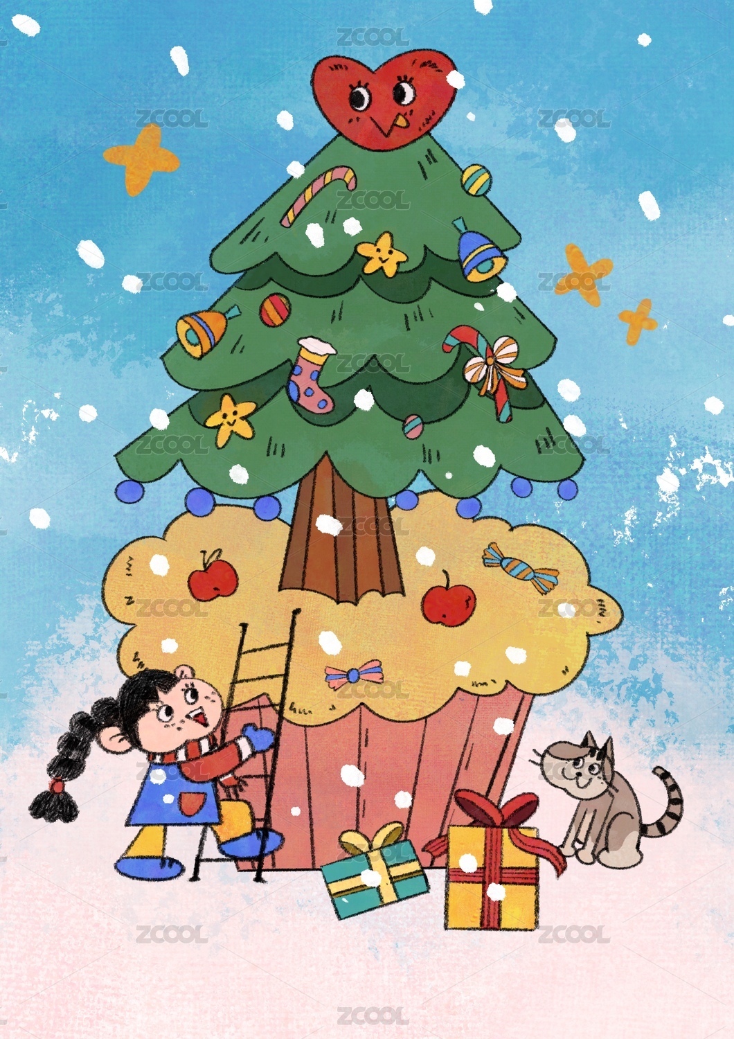卡通手绘圣诞节唯美风格男孩送礼物开心插画