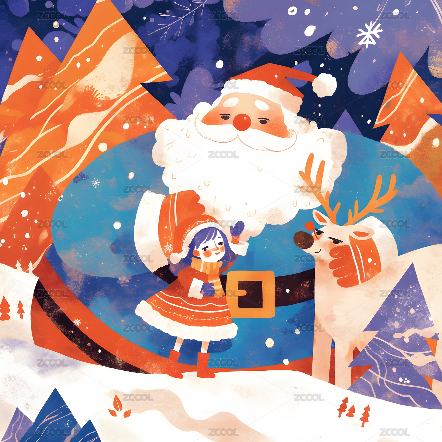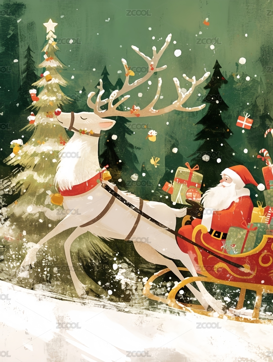 圣诞节骑着驯鹿的小女孩一起在森林里