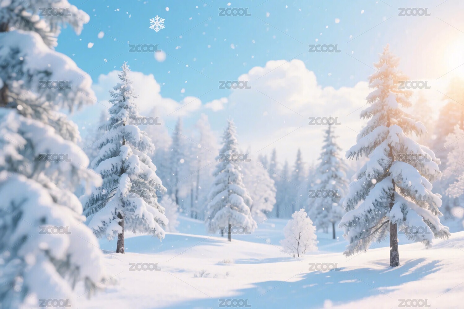 冬日雪景阳光下的松树林