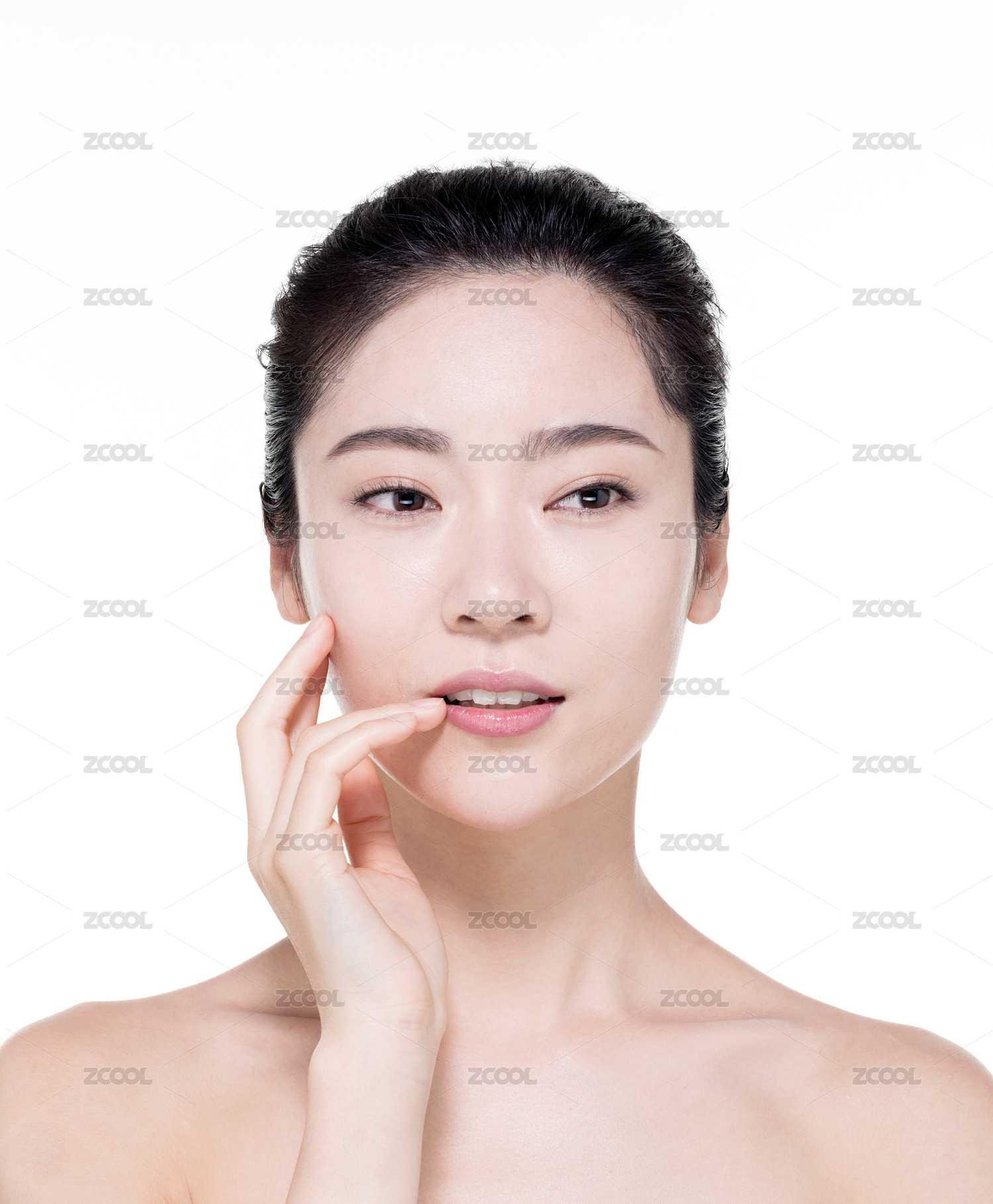 一位年轻的亚裔女性站在纯色背景前用手指轻抚脸颊