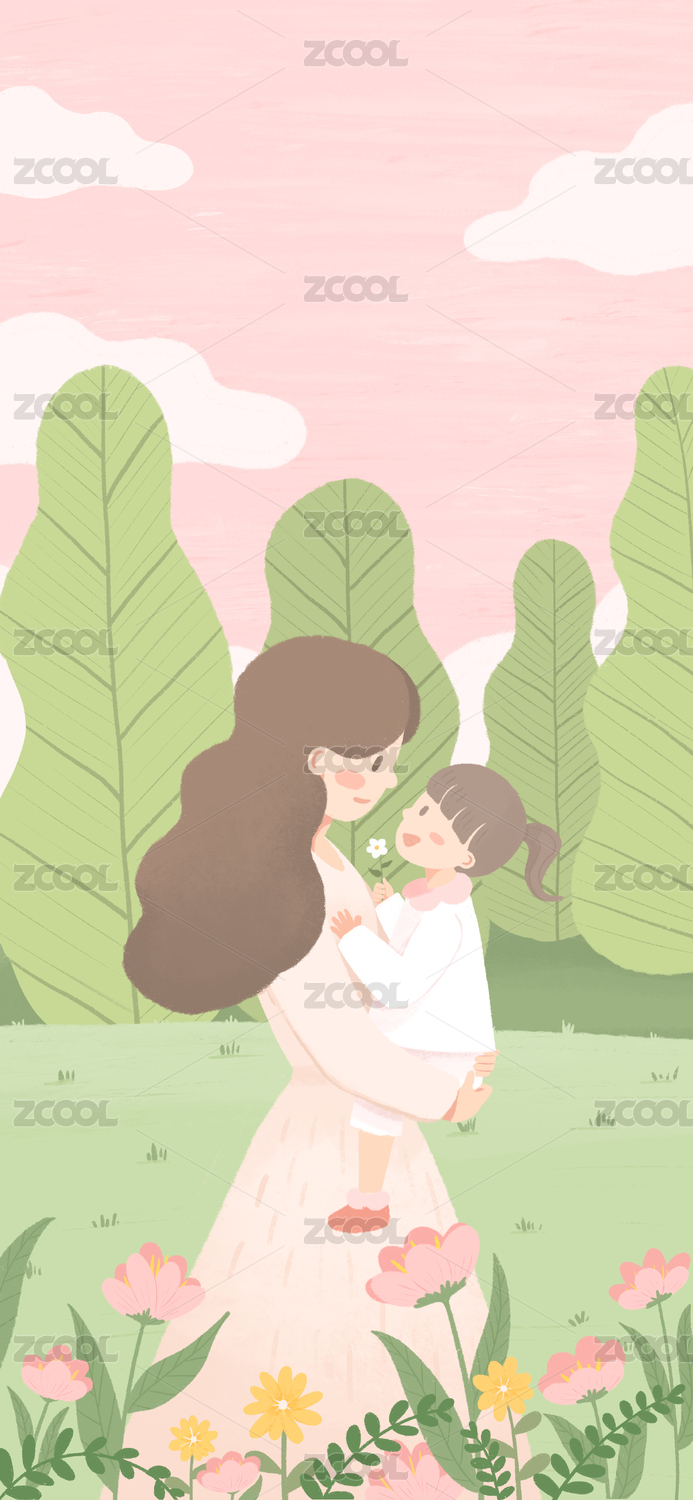 花丛中妈妈抱着孩子插画
